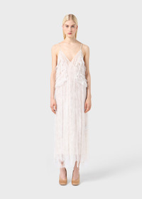 SUPPORTED BY THIN STRAPS JOINED AT THE BACK, THIS LONG CHANTILLY LACE DRESS IS ADORNED WITH A RUFFLE MOTIF. THE HEM IS IRREGULAR AND HAS A PLUNGE BACK NECKLINE. COMPOSITION: 50%PA 50%VI - CHANTILLY LACE - RUFFLED WAIST - JOINED STRAPS AT THE BACK - V-NECK - ASYMMETRICAL HEM - PLUNGE NECKLINE ON THE BACK - REMOVABLE SLIP - ANKLE-LENGTH CUT - REGULAR FIT DETAILS COLORS: WHITE