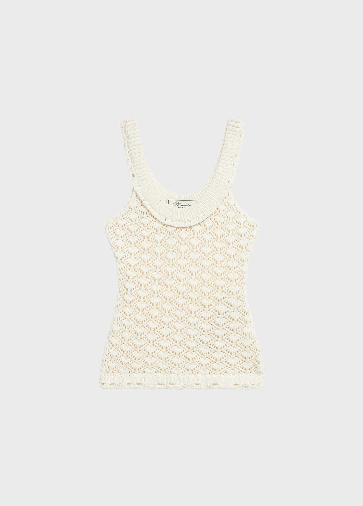 Lace-stitch cotton knit top with a wide ribbed round neck and openwork trims. - Lace-stitch cotton knit - Openwork trims - Sleeveless - Shoulder straps - Round ribbed neckline - Body-hugging fit - Made in Italy DETAILS Composition: External fabric: 62% Cotton, 38% Polyamide Very gentle wash at max 30°C; Do not bleach; Do not tumble dry; Iron at low temperature - without steam; Dry clean with tetrachloroethylene or hydrocarbons - gentle cycle; Dry flat; Wash inside out