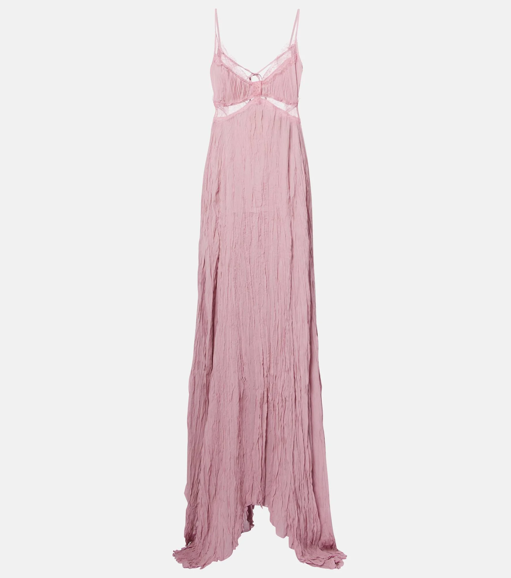 Blumarine captures the opulence of the '00s, contemporizing the Y2K aesthetic for a modern audience. This gown is cut from georgette with a plisse finish, complemented by an asymmetric skirt and delicate lace trims. Product Details - Material: 100% viscose - Care instructions: dry clean - Made in Italy - Color: pink - Designer color name: Pink - Lining: 100% polyester - Lace: 100% polyamide - Closure: buttoned back - Self-tie back - Item number: P01137399 Size & Fit - Fits large to size - we recommend trying one size smaller - Low back - Cinched waist - Non-stretchy fabric - The model seen in the picture is 178cm-5'10" and wearing a size IT 38