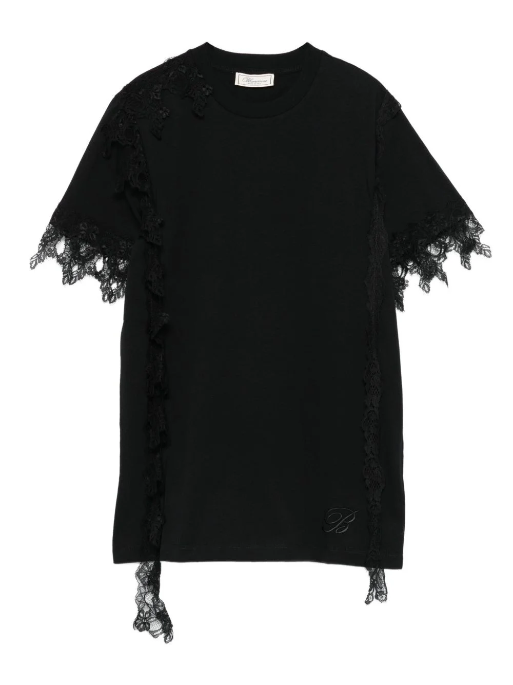 lace-trimmed short-sleeve top Highlights - Black - Lace trim - Short sleeves - Round neck - Straight hem - Side lace detailing Made in Italy Composition Cotton 100%, Polyester 100%, Polyamide 75%, Ramie 25% SIZE & FIT Model measurements Height 5 ft 10 in(1.77 m) Bust/Chest 32.28 in(82 cm) Hips 35.03 in(89 cm) Waist 25.19 in(64 cm) Washing instructions Hand Wash