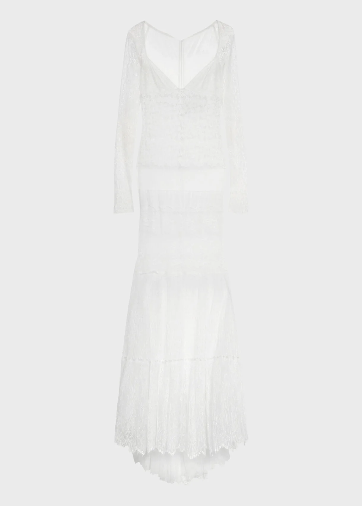Long see-through dress in rebrode lace with sweetheart neckline, long sleeves with flared cuffs, tulle inserts at sides and back, and valenciennes lace ruffled skirt. - See-through rebrode lace - Sweetheart neckline - Long sleeves with corolla cuffs tulle inserts at sides and back - Valenciennes lace skirt with flounces - Zip closure at back - Floor-length - Body-hugging fit - Made in Italy DETAILS To find the correct size for you, please consult the Size Guide. Composition: Main fabric: 100% polyamide; Secondary lining: 75% polyamide, 25% elastane; Trimming: 80% polyamide, 20% elastane; Lace: 50% polyamide, 50% viscose; Tulle: 90% polyamide, 10% elastane; Lace 2: 85% polyamide, 15% elastane Do not wash; Do not bleach; Do not tumble dry; Iron at low temperature - no steam; Dry clean with tetrachloroethylene or hydrocarbons - gentle cycle; Do not iron pleats; Wash inside out; Do not iron lining; Iron inside out