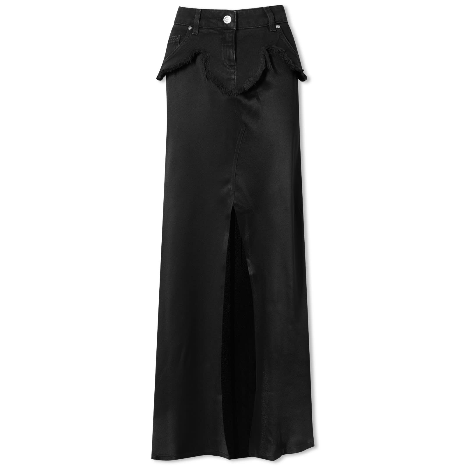Regardless of whether you experienced mid-'00s fashion era firsthand, it's making a powerful comeback—and Blumarine is at the helm of the resurgence. The Italian brand blends a satin slip skirt and denim mini into one, creating a striking contrast. A vintage effect jean waistband is frayed and layered over a fluid like satin skirt with a dramatic front slit. - 55% Acetate, 45% Silk - Regular Fit - Front Slit - Denim Waistband With Fringe Hem - Zip Fly & Button Closure - 2 Back Patch Pockets - Embroidered Branding - Dry Clean Only