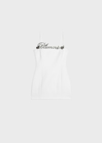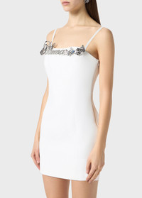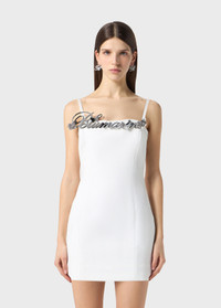 A metal blumarine l logo with roses and butterflies decorates the yoke of this mini dress in cady crepe, featuring spaghetti straps and a straight neckline. - Cady crepe - Metal blumarine lettering logo with roses and butterflies applied on the yoke - Straight neckline - Sleeveless cut - Shoulder pads - Zip closure at side - Fully lined - Mini length - Body-hugging fit - Made in Italy DETAILS To find the correct size for you, please consult the Size Guide. Composition: Main fabric: 96% polyamide, 4% elastane; Main lining: 100% polyester; Secondary lining: 71% polyamide, 29% elastane; Accessory: 100% brass; Trimmings: 85% polyamide, 15% elastane Hand wash - room temperature; Do not bleach; Do not tumble dry; Iron at low temperature - no steam; Dry clean with tetrachloroethylene or hydrocarbons - gentle cycle; Do not expose to direct heat; Remove detachable accessories before washing; Wash inside out; Iron inside out