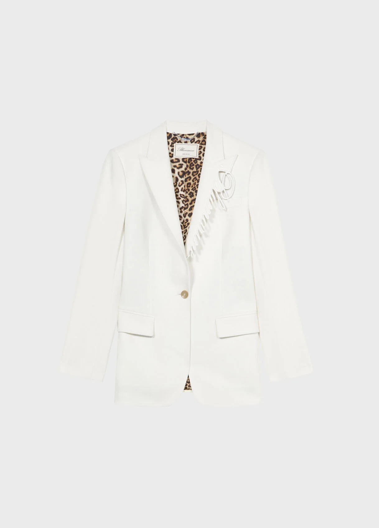 Single-breasted jacket in stretch wool twill with embroidered blumarine logo in thread on one lapel, welt pocket, flap pockets, and single-button closure. - Stretch wool twill - Blumarine logo embroidered in thread on one lapel - Single-breasted style - Collar - Lapels - Chest pocket - Flap pockets at the hips - Long sleeves - Buttoned cuffs - Button closure - Fully lined. regular fit - Made in Italy DETAILS To find the correct size for you, please consult the Size Guide. Composition: Main fabric: 54% polyester, 44% virgin wool, 2% elastane; Main lining: 100% polyester Wash delicate cycle max 30°C; Do not bleach; Do not tumble dry; Iron at low temperature - no steam; Dry clean with tetrachloroethylene or hydrocarbons - gentle cycle; Wash inside out; Iron inside out