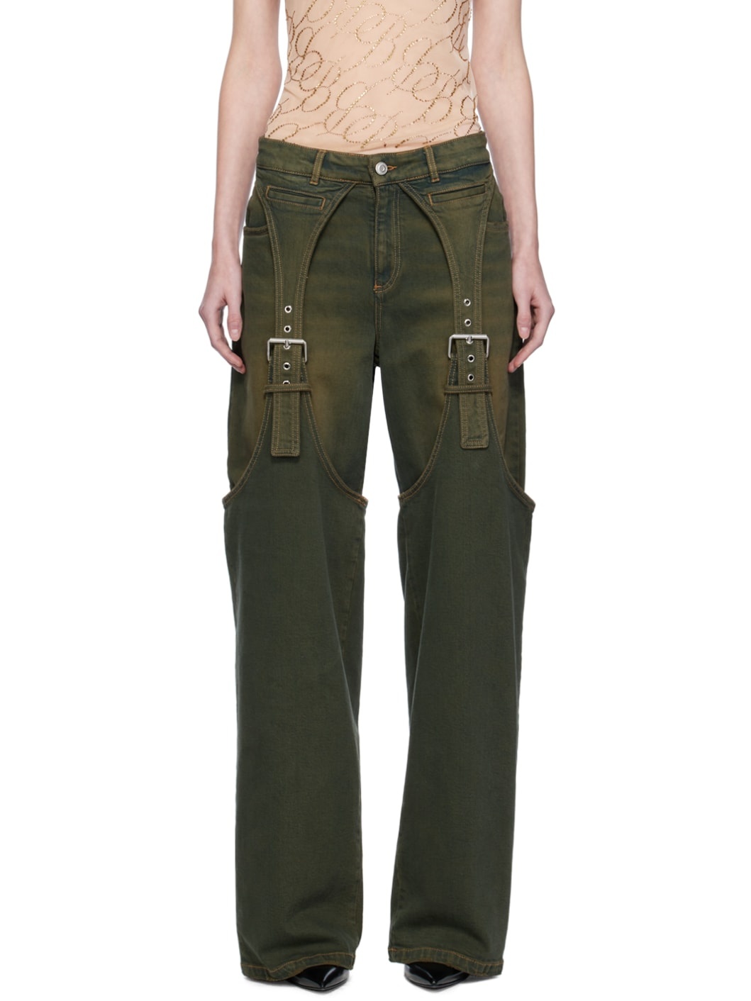 Stretch denim jeans. Washed effect and fading throughout. · Layered construction · Belt loops · Four-pocket styling · Zip-fly · Detachable pin-buckle overlay at legs · Logo embroidered at back waistband and pockets · Logo-engraved silver-tone hardware Supplier color: Midnight/Bronze