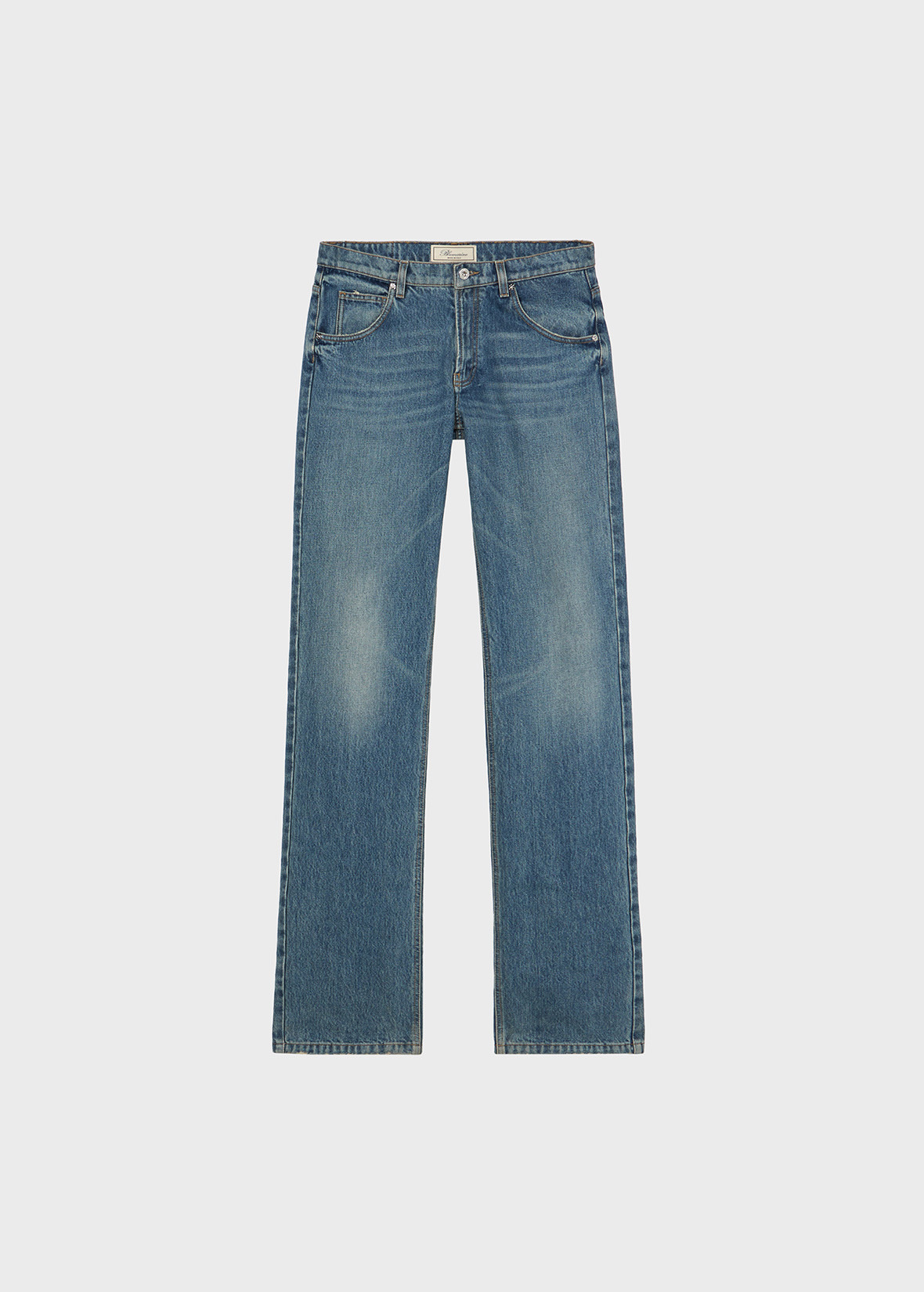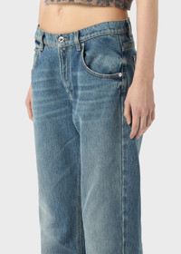 FIVE-POCKET STRAIGHT-LEG JEANS IN STONE-WASHED DENIM WITH BLUMARINE LOGO PRINTED IN FLOCK ON THE BACK. COMPOSITION: 100%CO - STONE-WASHED DENIM - BLUMARINE LOGO PRINTED IN FLOCK ON THE BACK - STRAIGHT LEG STYLE - FIVE-POCKET STYLE - BELT LOOPS - ZIPPER AND BUTTON CLOSURE - PUDDLE BOTTOM - B MONOGRAM LABEL AT BACK - REGULAR FIT DETAILS COLORS: BLUE