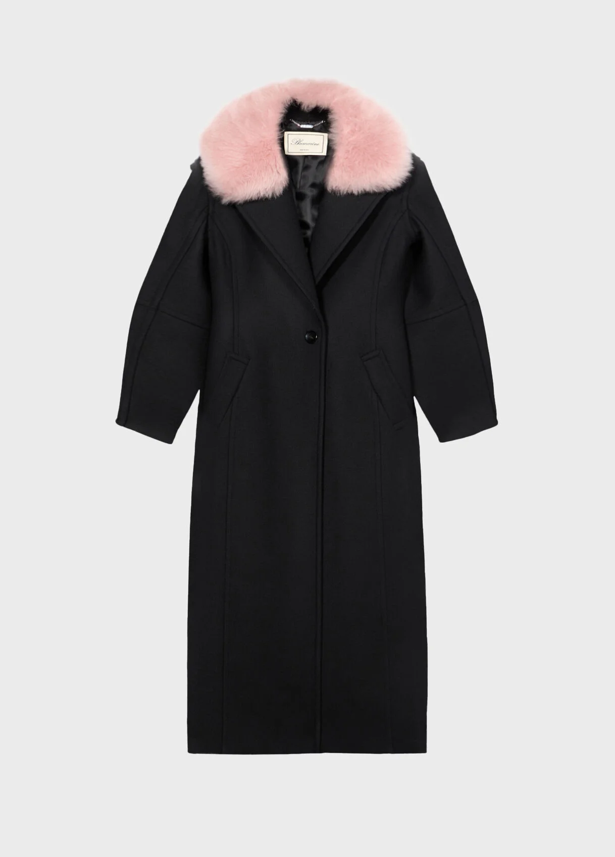 Long wool coat with a fur collar and raised topstitching, featuring notched lapels, single-button closure, and side slits. - Wool felt - Fur collar - Single-breasted style - Relief seams - Lapels - Long sleeves - Slant pockets - One-button closure - Side vents - Ankle-length cut - Loose fit - Made in Italy DETAILS To find the correct size for you, please consult the Size Guide. Composition: Main fabric: 70% wool, 30% polyamide; Main lining: 52% acetate, 48% viscose; Padding (Fibers): 100% polyester; Secondary lining: 100% polyester Do not wash; Do not bleach; Do not tumble dry; Iron at low temperature - no steam; Dry clean with tetrachloroethylene or hydrocarbons - gentle cycle; Remove detachable accessories before cleaning; Clean inside out; Iron inside out