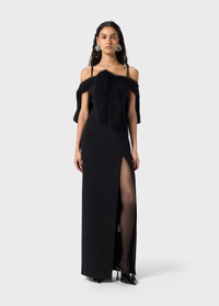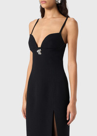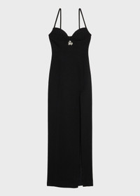 long dress in double crepe with heart neckline, metal rose detail, deep side slit. - Double crepe - Shaped silhouette - Metal flower application - Heart neckline - Sleeveless - Shoulder straps - Side slit - Back neckline - Zip closure at the back - Inner lining - Ankle length - Regular fit - Made in Italy DETAILS To find the correct size for you, please consult the Size Guide. Composition: Main fabric: 95% polyester, 5% elastane; Main lining: 100% polyester Do not wash; Do not bleach; Do not tumble dry; Iron at low temperature - no steam; Dry clean with tetrachloroethylene or hydrocarbons - gentle cycle; Reshape after cleaning; Protect trims during clean; Clean inside out; Iron inside out