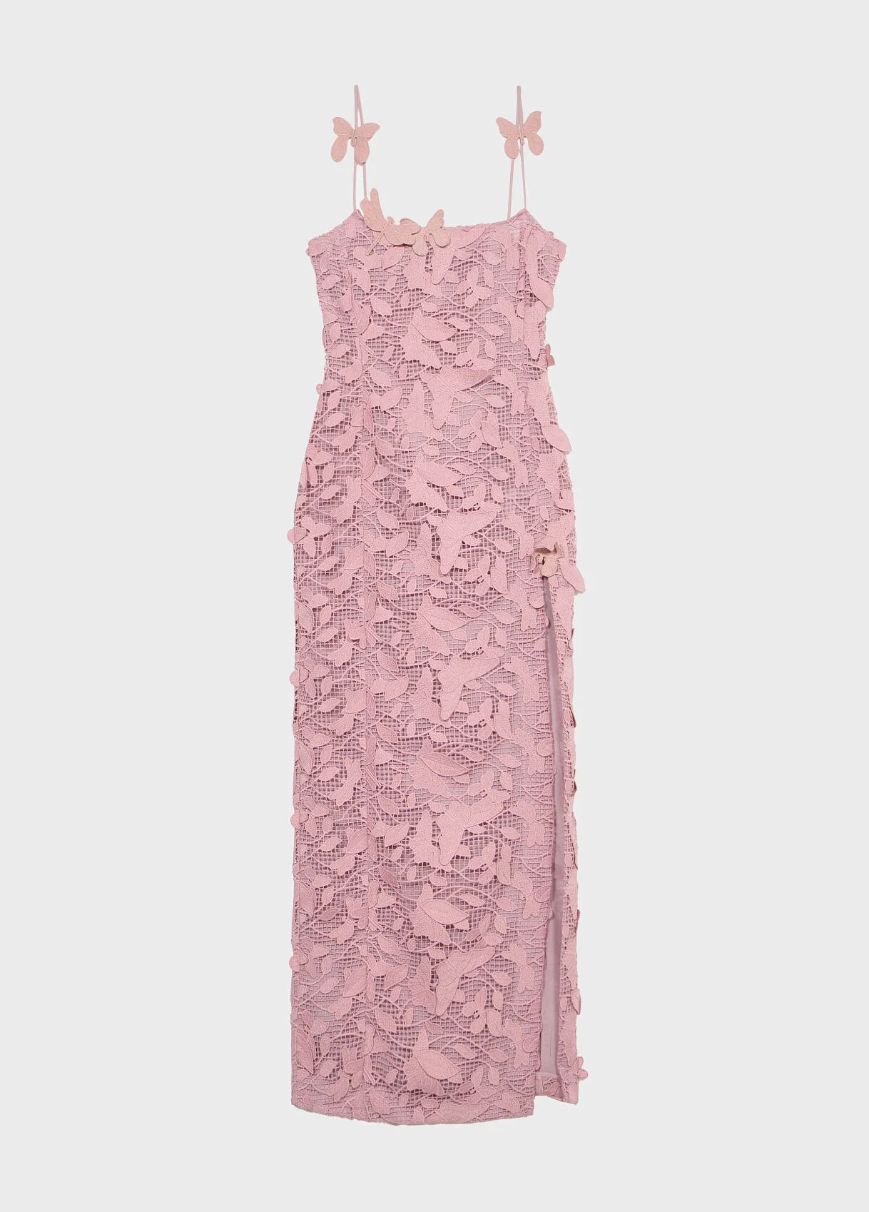 Long dress in 3D macrame lace on a mesh base, side slit. - 3D macrame lace on mesh base - 3D butterflies applied - Column silhouette - Sleeveless - Straps - Straight neckline - Deep slit on one leg - Back neckline - Back zip closure with inner lining - Ankle length Regular fit DETAILS To find the correct size for you, please consult the Size Guide. Composition: Main fabric: 100% Polyester | Lining: 100% Polyester Gently wash at max 30°C; Do not bleach; Do not tumble dry; Iron at low temperature - no steam; Dry clean with tetrachlorethylene or hydrocarbons - delicate process; Wash inside out; Gentle spin; Wash in a mesh bag; Iron inside out