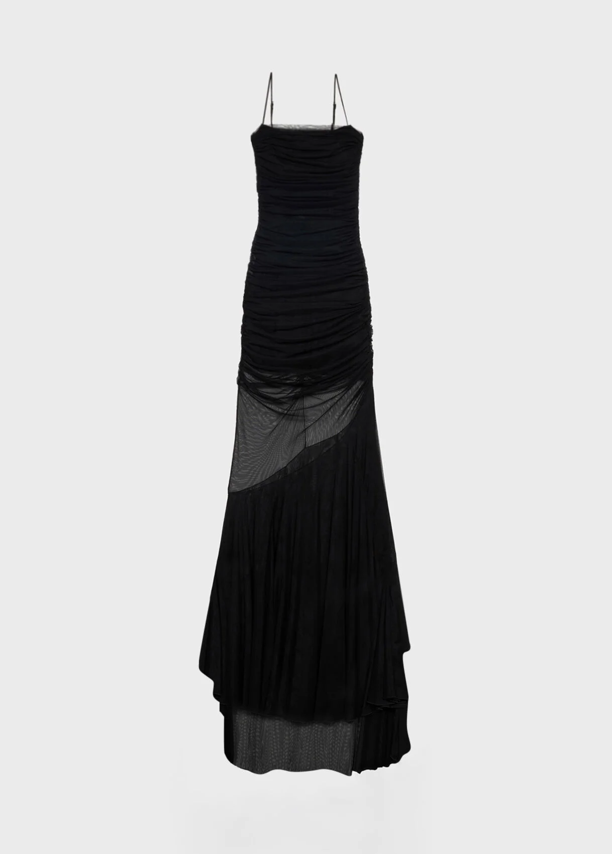 Corset top with ruffles and boning for long tulle dress with straps, straight neckline, full see-through skirt with diagonal flounce, low backline, and short train. - Tulle - Double-layered tulle bodice with boning and pleats - Straight neckline - Sleeveless cut - Shoulder pads - Sheer full skirt with flounce - Low-cut back - Zip closure at back - Fully lined - Short train - Floor-length - Body-hugging fit - Made in Italy DETAILS To find the correct size for you, please consult the Size Guide. Composition: Main fabric: 90% polyamide, 10% elastane; Main lining: 75% polyamide, 25% elastane; Secondary lining: 71% polyamide, 29% elastane Wash delicate cycle max 30°C; Do not bleach; Do not tumble dry; Iron at low temperature - no steam; Dry clean with tetrachloroethylene or hydrocarbons - gentle cycle; Wash inside out; Do not iron lining; Iron inside out