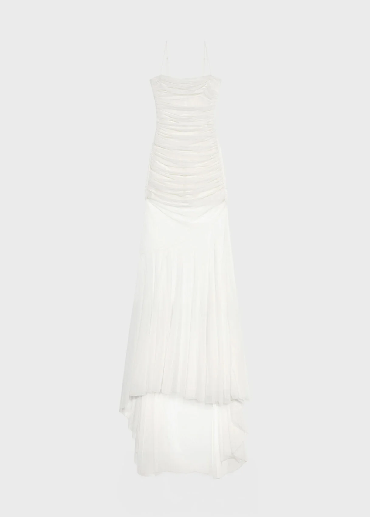 Corset top with ruffles and boning for long tulle dress with straps, straight neckline, full see-through skirt with diagonal flounce, low backline, and short train. - Tulle - Double-layered tulle bodice with boning and pleats - Straight neckline - Sleeveless cut - Shoulder pads - Sheer full skirt with flounce - Low-cut back - Zip closure at back - Fully lined - Short train - Floor-length - Body-hugging fit - Made in Italy DETAILS To find the correct size for you, please consult the Size Guide. Composition: Main fabric: 90% polyamide, 10% elastane; Main lining: 75% polyamide, 25% elastane; Secondary lining: 71% polyamide, 29% elastane Wash delicate cycle max 30°C; Do not bleach; Do not tumble dry; Iron at low temperature - no steam; Dry clean with tetrachloroethylene or hydrocarbons - gentle cycle; Wash inside out; Do not iron lining; Iron inside out