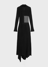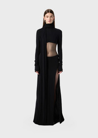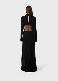 Long viscosity jersey dress with neck scarf, long sleeves, tulle insert at the waist, side slit, cut-out detail at the back. - Viscose jersey - Neck scarf - Tulle insert at the waist - Side slit - Cut-out detail at the back - Floor-length - Body-fitting - Made in Italy DETAILS To find the correct size for you, please consult the Size Guide. Composition: Main fabric: 100% viscose; Fabric 2: 90% polyamide, 10% elastane Wash delicate cycle max 30°C; Do not bleach; Do not tumble dry; Iron at low temperature - no steam; Dry clean with tetrachloroethylene or hydrocarbons - gentle cycle; Dry flat in shade; Wash inside out; Gentle spin; Iron inside out