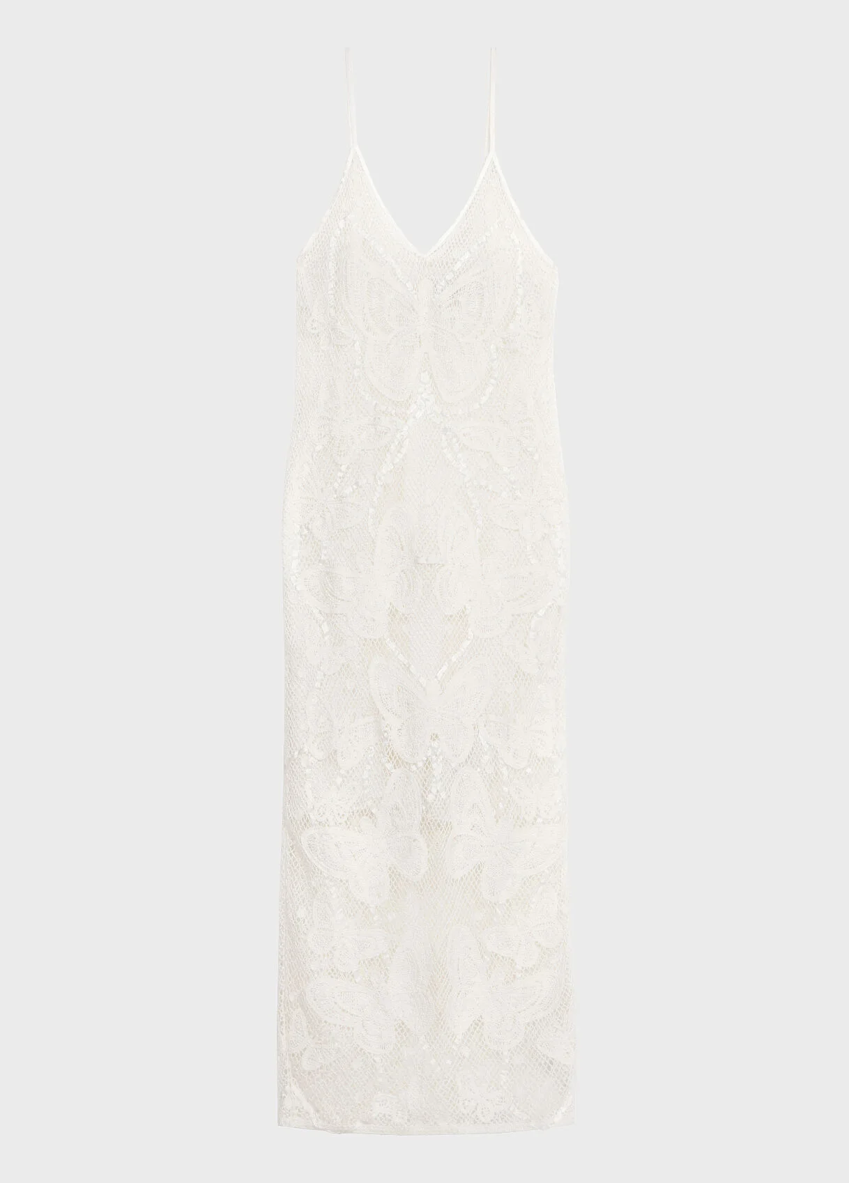 Long cotton mesh dress with handmade butterfly embroidery and satin ribbon ramage, featuring a back slit. - Cotton mesh - Handmade butterfly embroidery - Satin ribbon ramage application - Sleeveless - Straps - V-neckline - Back neckline - Back slit - Removable slip - Ankle length - Regular fit DETAILS To find the correct size for you, please consult the Size Guide. Composition: Main fabric: 100% Cotton | Secondary fabric: 100% Polyester | Underskirt: 100% Cotton Hand wash - room temperature; Do not bleach; Do not tumble dry; Iron at low temperature - without steam; Dry clean with tetrachloroethylene or hydrocarbons - gentle process; Dry flat in the shade