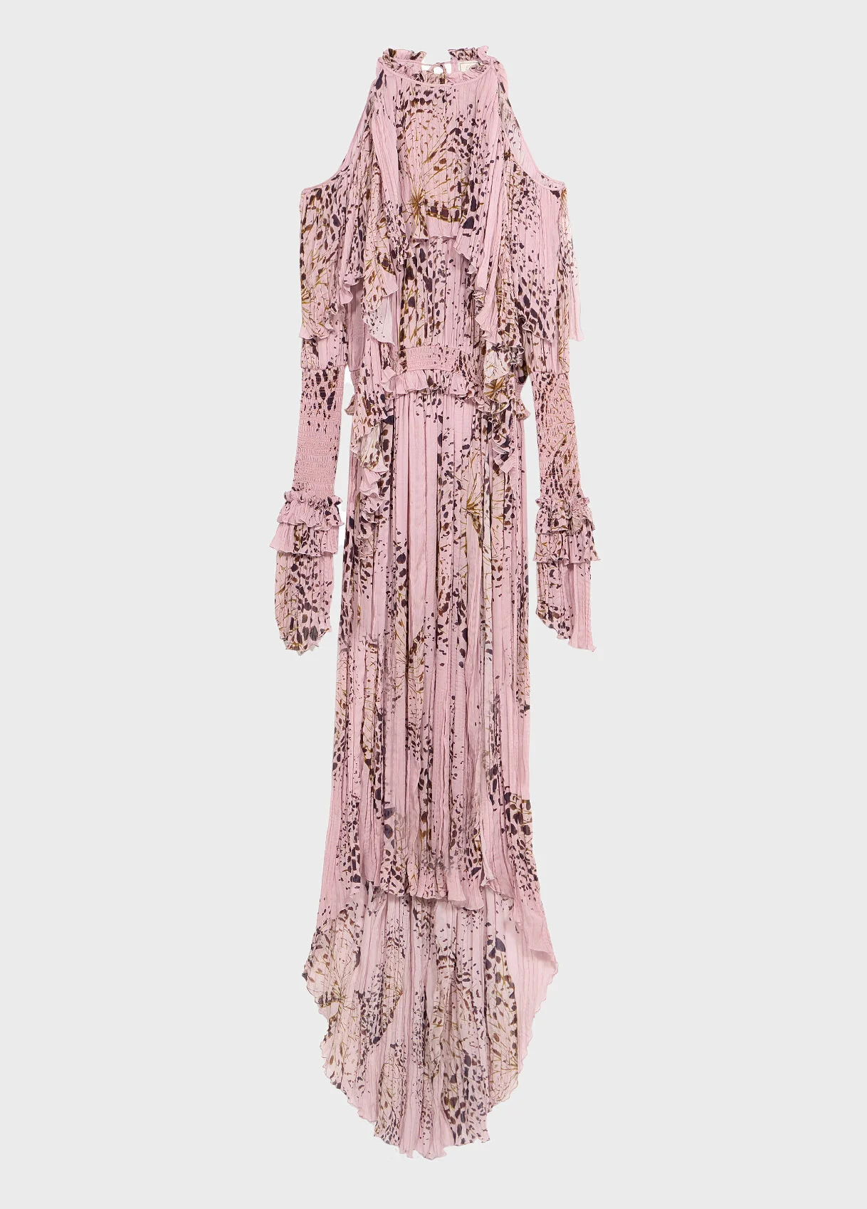Long plisse viscose georgette dress with butterfly print, featuring a halter neckline and a side slit. - Plisse viscose georgette - Butterfly print - Halter neckline - Ruffle detail at the neckline - Open shoulders - Long sleeves - Smocked cuffs with ruffles - Smocked waist with ruffles - Slit on one leg - Tie closure at the back - Regular fit - Keyhole neckline at the back - Short train - Internal lining - Floor-length - Regular fit DETAILS To find the correct size for you, please consult the Size Guide. Composition: Main fabric: 100% Viscose | Lining: 100% Polyester Gently wash at max 30°C; Do not bleach; Do not tumble dry; Do not iron; Dry clean with tetrachlorethylene or hydrocarbons - delicate process; Wash inside out; Gentle spin; Wash in a mesh bag