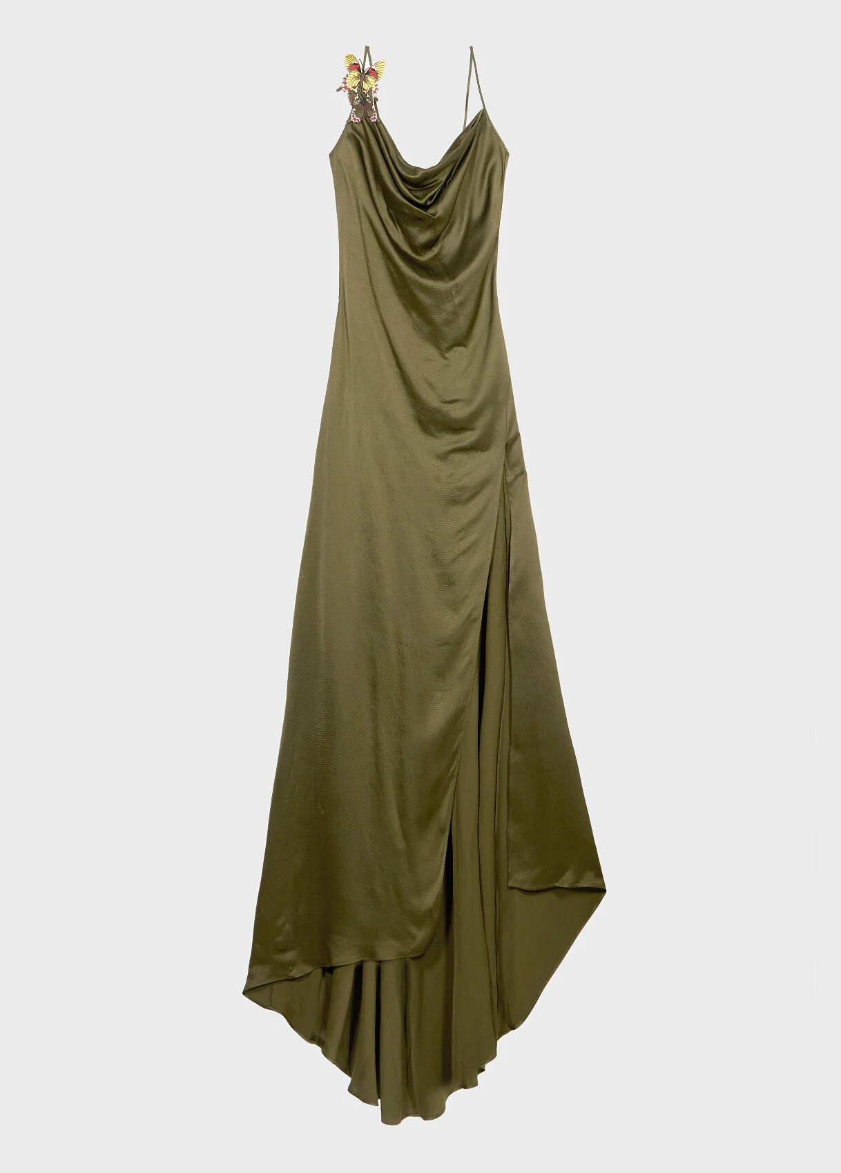 Long dress in hammered viscose satin with thin straps, featuring a 3D embroidered butterfly, cowl neckline, and side slit. - Hammered viscose satin - 3D embroidered butterfly - Sleeveless - Thin straps - Cowl neckline - Wide skirt - Slit on one leg - Back neckline - Back zip closure - Short train at the back - Floor-length - Regular fit DETAILS To find the correct size for you, please consult the Size Guide. Composition: Main fabric: 98% Viscose, 2% Elastane | Patch: 100% Polyester Do not wash; Do not bleach; Do not tumble dry; Iron at low temperature - without steam; Dry clean with tetrachloroethylene or hydrocarbons - delicate process; Wash inside out; Wash in a mesh bag; Iron inside out; Do not iron decorations
