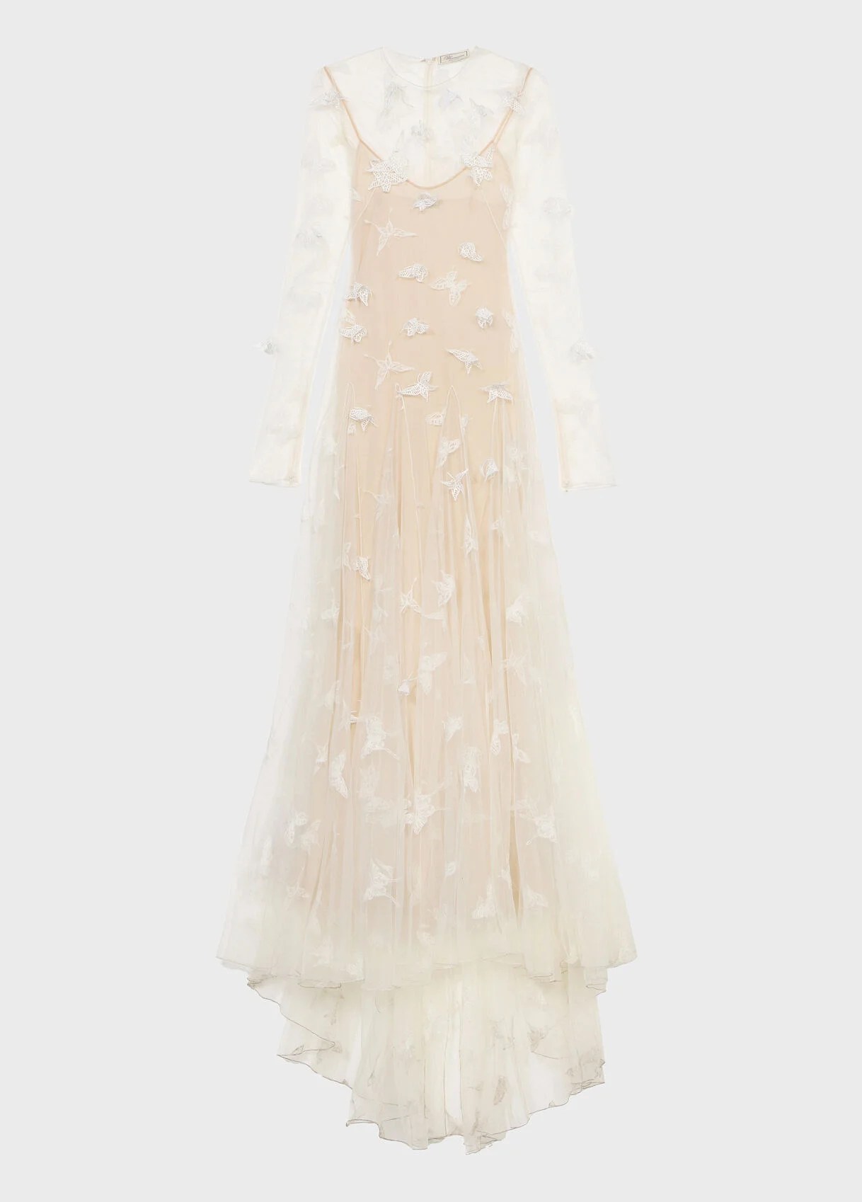 Long see-through tulle dress with 3D embroidered butterflies. - See-through tulle - Thread embroidered butterflies - 3D butterfly appliques - Round neckline - Long sleeves - Flared skirt - Short train - Back zip closure - Removable slip - Floor length Regular fit DETAILS To find the correct size for you, please consult the Size Guide. Composition: Main fabric: 52% Polyamide, 48% Polyester | Slip: 75% Polyamide, 25% Elastane Gently wash at max 30°C; Do not bleach; Do not tumble dry; Iron at low temperature - without steam; Dry clean with tetrachloroethylene or hydrocarbons - gentle process; Wash inside out; Gentle spin; Wash in a mesh bag; Iron inside out