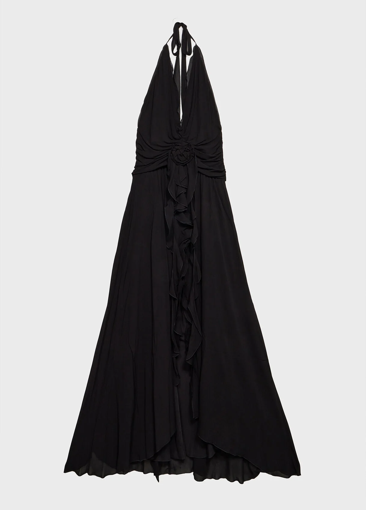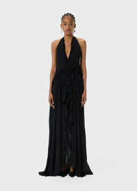 Long viscose georgette dress with a halterneck, a fabric rose detail with flounces, a front slit, and a deep neckline on the back. - Viscose georgette - Halterneck with a ruched trim - Sleeveless - Hand-made rose - Flounced sash belts - Front slit - Deep neckline on the back - Floor length - Regular fit - Made in Italy DETAILS Composition: External fabric: 100% Viscose; Main lining: 100% Polyester Do not wash; Do not bleach; Do not tumble dry; Iron at low temperature - without steam; Dry clean with tetrachloroethylene or hydrocarbons - gentle cycle; Wash inside out; Wash in a mesh bag; Iron inside out