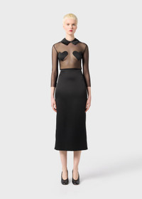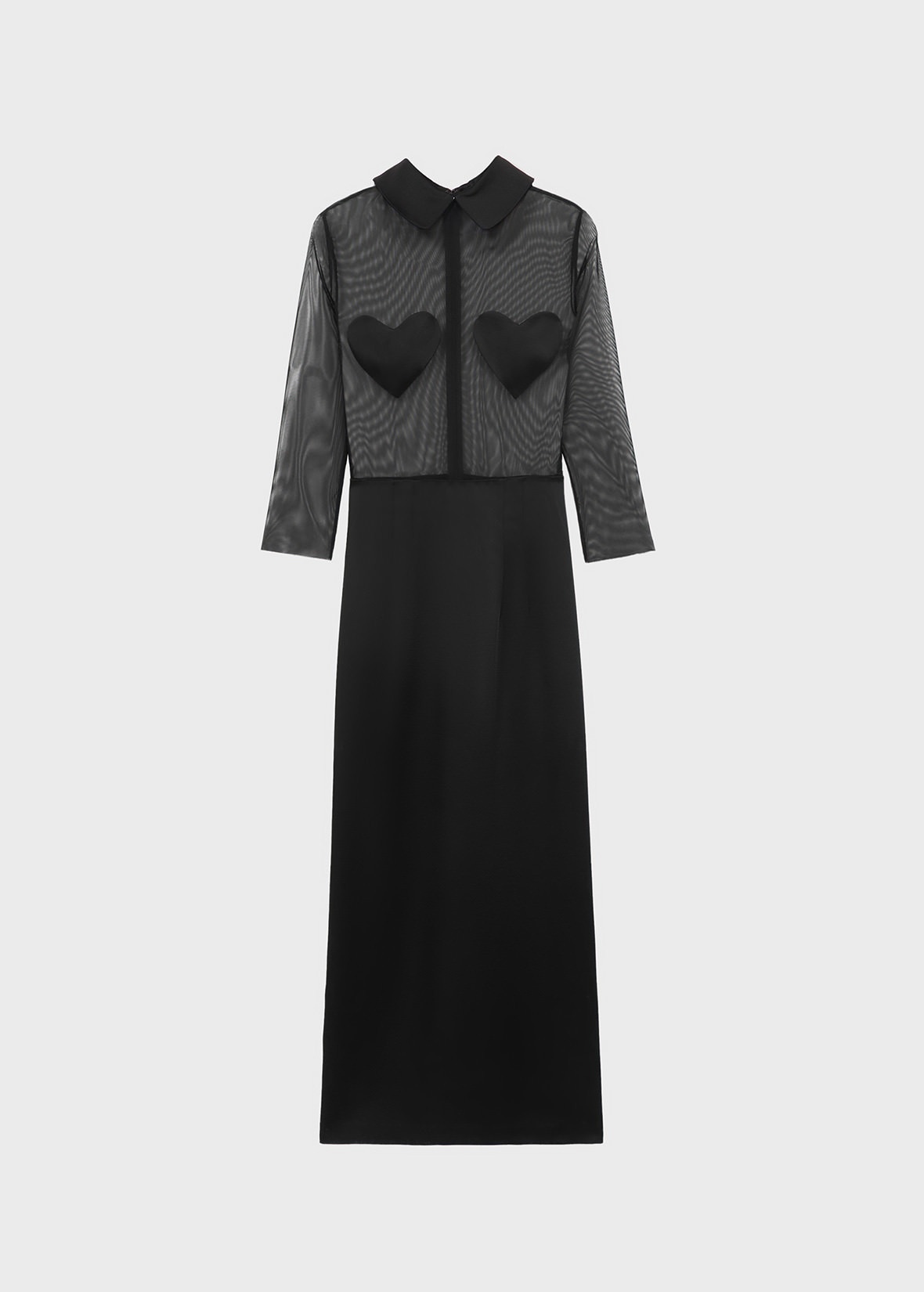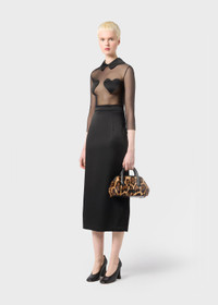 A PLAY OF TRANSPARENCIES FOR THE ICONIC MIDI DRESS WITH BODICE AND THREE-QUARTER SLEEVES IN TULLE. THE COLLAR AND HEART PATCHES ON THE CHEST ARE IN STRETCH SATIN, AS IS THE PENCIL SKIRT WITH A BACK SLIT. COMPOSITION: 71%AC 27%VI 2%EA - STRETCH SATIN AND TULLE - COLLAR - HEART-SHAPED PATCH AT THE BREASTS - THREE-QUARTER LENGTH SLEEVES - BACK VENT - ZIP CLOSURE AT BACK - MIDI LENGTH - TAPERED FIT DETAILS COLORS: BLACK