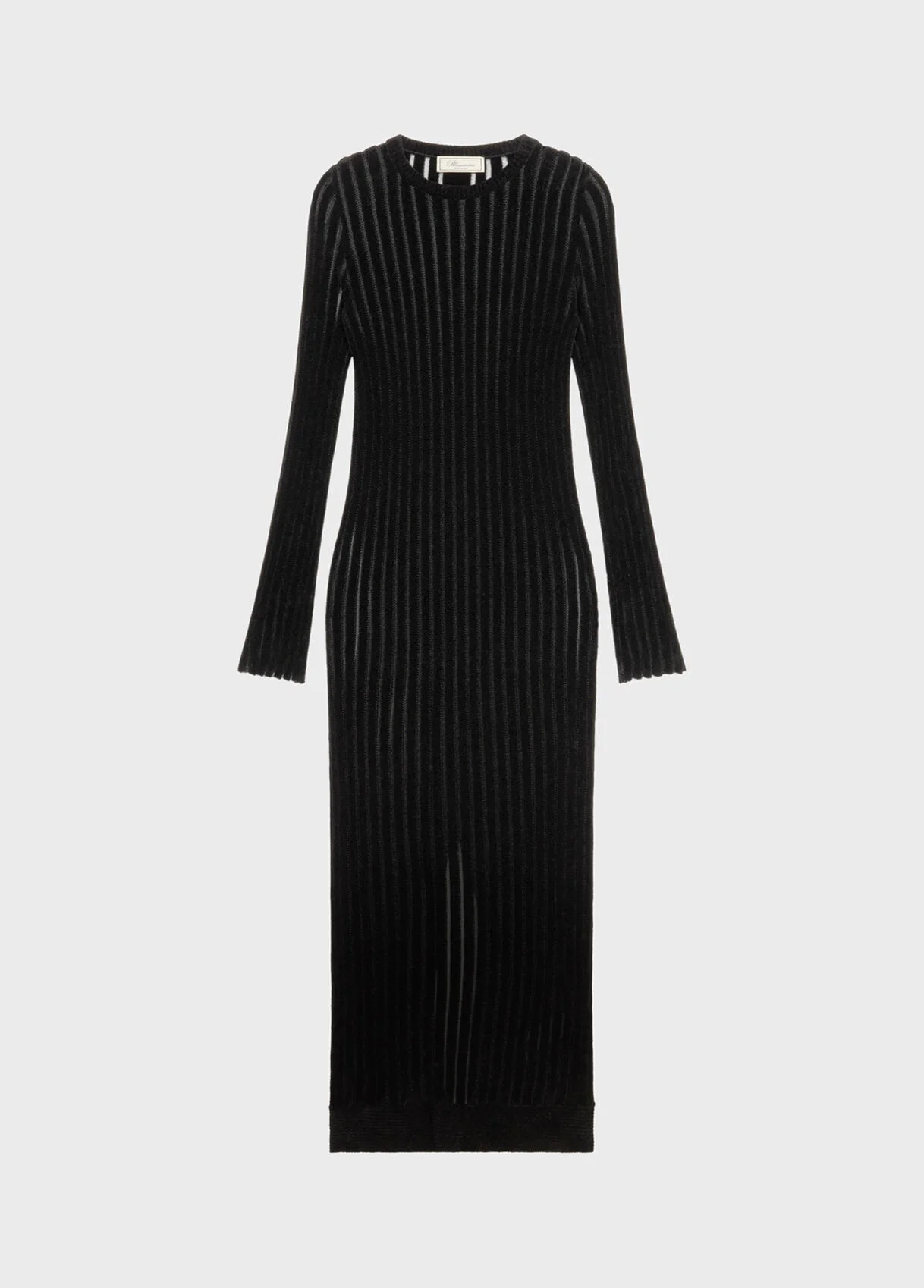 midi dress composition: velour with a see-through stripe pattern, long sleeves, back slit. - Composition: velour with a see-through stripe pattern - Round neckline - Long sleeves - Back slit - Midi length - Body-fit - Made in Italy DETAILS To find the correct size for you, please consult the Size Guide. Composition: Yarn 1: 100% viscose; Yarn 2: 100% polyester Hand wash - room temperature; Do not bleach; Do not tumble dry; Iron at low temperature - no steam; Dry clean with tetrachloroethylene or hydrocarbons - gentle cycle; Dry flat in shade; Wash inside out; Wash in a mesh bag