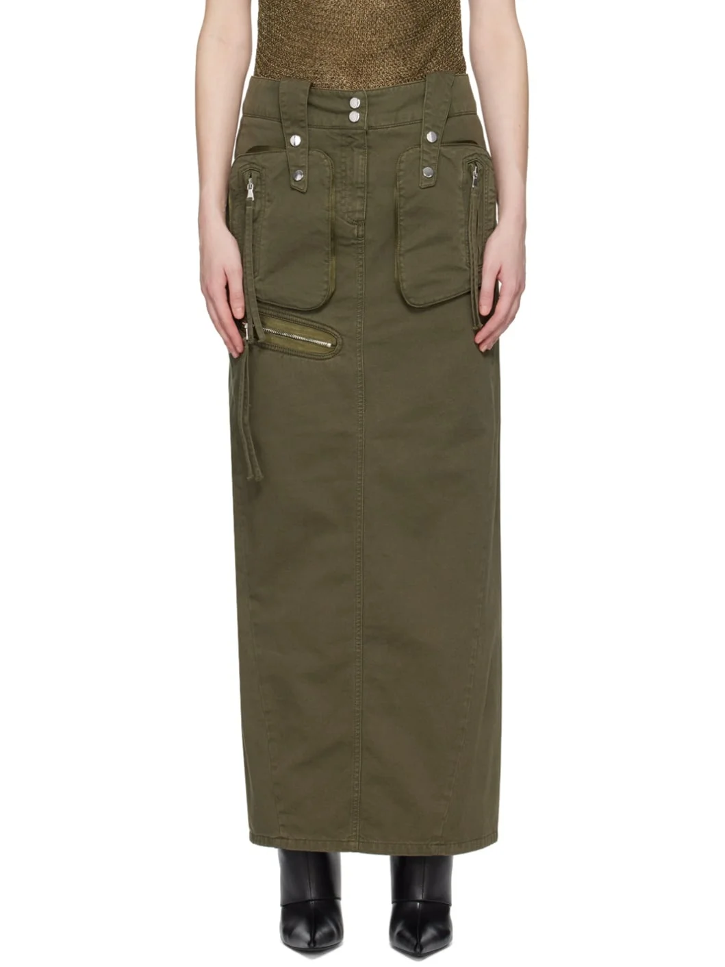 Cotton twill skirt. · Press-stud fastening at belt loops · Zip-fly · Zip pockets at front · Logo embroidered at back waistband · Satin trim at back waist · Central vent at back hem · Partial satin lining · Logo-engraved silver-tone hardware Supplier color: Militare Body 1: 100% cotton. Body 2: 100% viscose. Made in Albania 241901F093001