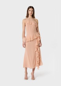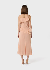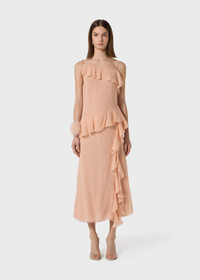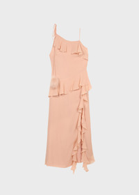 MIDI DRESS MADE OF GEORGETTE WITH RUFFLES ON THE NECKLINE, WAIST, AND FRONT SLIT. DETAIL OF TIES WITH FEATHER POM-POMS. COMPOSITION: 100% SE - GEORGETTE - SPAGHETTI STRAPS - RUFFLES - FULLY LINED - STRINGS WITH FEATHER POM-POMS - REGULAR FIT DETAILS COLORS: PINK