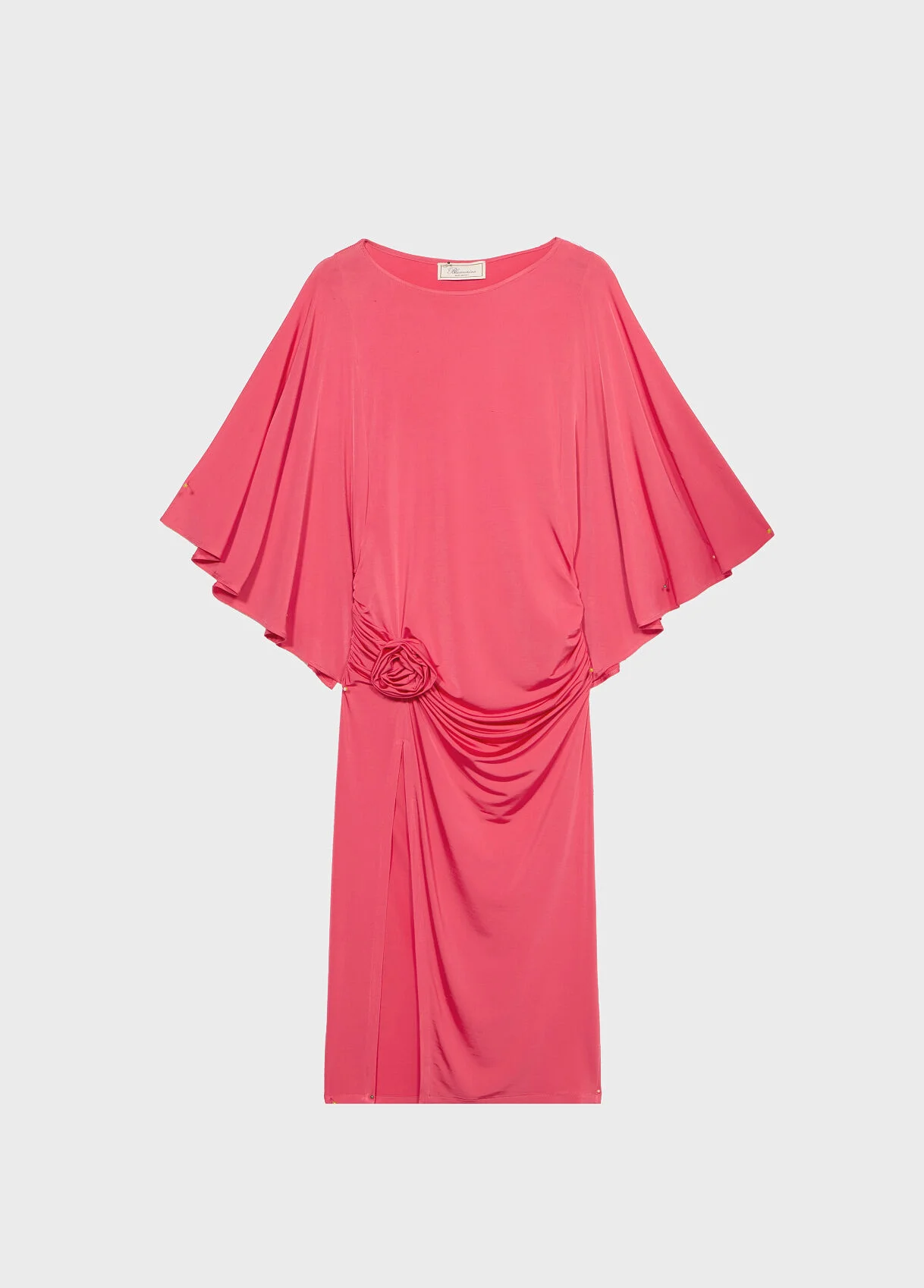 Shiny viscose jersey for the midi dress with wide sleeves, 3D rose applied at the waist, side slit. - Shiny viscose jersey - Round neckline - Batwing sleeves - 3D rose applied at the waist - Side slit on one leg - Midi length - Regular fit DETAILS To find the correct size for you, please consult the Size Guide. Composition: Main fabric: 93% Viscose, 7% Elastane | Pin: 85% Viscose, 8% Iron, 5% Elastane, 2% Brass Hand wash - room temperature; Do not bleach; Do not tumble dry; Iron at low temperature - no steam; Dry clean with tetrachloroethylene or hydrocarbons - gentle process; Dry flat in the shade; Do not soak; Remove detachable accessories before washing; Wash inside out; Wash in a mesh bag; Iron inside out