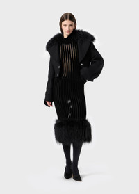 midi skirt composition: velour with see-through stripe pattern, side slit, bottom composition: made of alpaca sheepwool. - Composition: velour with see-through stripe pattern - Elasticized waist - Side slit - Bottom composition: made of alpaca sheepwool - Midi length - Regular fit - Made in Italy DETAILS To find the correct size for you, please consult the Size Guide. Composition: Yarn 1: 100% viscose; Yarn 2: 100% polyester; Main lining: 100% polyester; Filling (Fibers): 100% polyester;Fur insert: lamb Hand wash - room temperature; Do not bleach; Do not tumble dry; Iron at low temperature - no steam; Dry clean with tetrachloroethylene or hydrocarbons - gentle cycle; Dry flat in shade; Wash separately; Remove accessories before washing; Wash inside out; Wash in a mesh bag