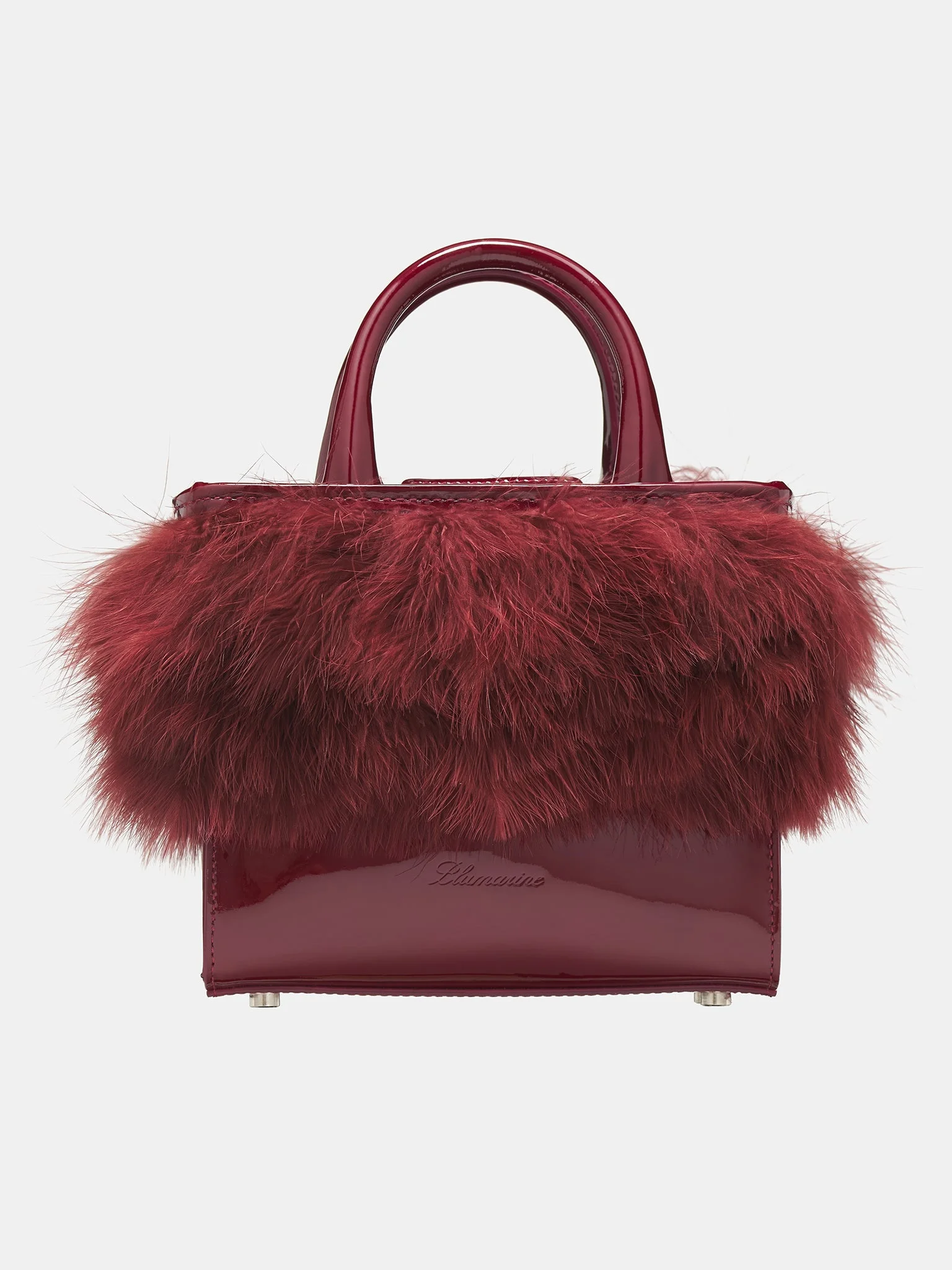 BLUMARINE bag in burgundy, paneled leather construction, patent finish, feather embellishment, fixed twin top handles, top strap closure, bottom metal studs, lined. Made in Italy Outer: 100% Cow Leather Inner: 100% Cotton Trim: 100% Meleagris Feathers One Size