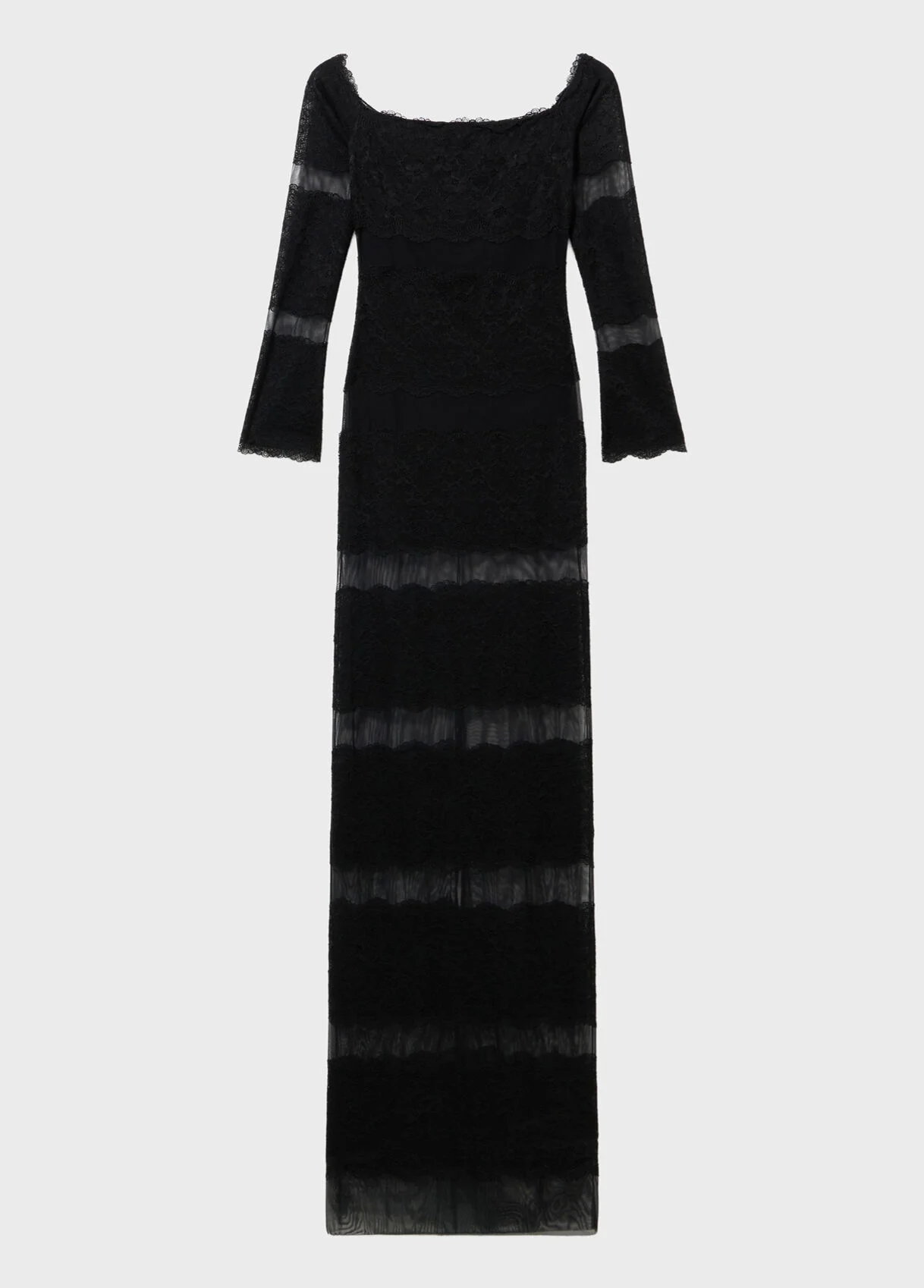 This off-the-shoulder long dress with long sleeves and a rear slit features alternating lace ruffles and tulle detailing. - Lace - Tulle - Cold shoulders - Straight neckline with scalloping - Long sleeves with scalloped cuffs - Matte bodice - See-through straight skirt - Vented back - Floor length - Body-hugging fit - Made in Italy DETAILS Composition: External fabric: 82% Polyamide, 18% Elastane; Main lining: 75% Polyamide, 25% Elastane; Lace: 85% Polyamide, 15% Elastane Gentle wash at max 30°C; Do not bleach; Do not tumble dry; Do not iron; Dry clean with tetrachloroethylene or hydrocarbons - gentle cycle; Use detergent without optical brightener; Reshape after washing; Wash inside out; Gentle spin cycle; Wash in a mesh bag; Do not twist or wring