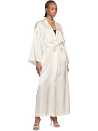 Polyester satin robe. · Shawl collar · Belt loops with detachable self-tie belt · Integrated self-tie fastening at interior · Seam pockets · Dropped shoulders · Crystal-cut logo appliques at back Supplier color: White pearl Body: 100% polyester. Trim: 100% glass. Made in Portugal 251901F077002