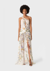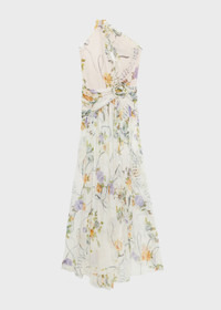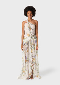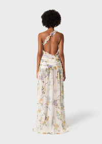ONE-SHOULDER LONG DRESS IN SILK CREPONNE, FEATURING AN ASYMMETRIC BODICE AND RUFFLES. FRONT CUT-OUT TRANSITIONING INTO A SLIT AND HAND-APPLIED ROSE. COMPOSITION: 100% SILK LINING: 100% POLYESTER - PRINTED SILK CREPONNE WITH FLORAL PATTERN - ONE-SHOULDER STYLE - CUT-OUT AND RUFFLED BODICE - SLEEVELESS CUT - HAND-MADE 3D ROSE DECORATION - ASYMMETRIC PLEATED SKIRT - FRONT VENT - PLUNGE NECKLINE ON THE BACK - ZIP CLOSURE AT BACK - FULLY LINED - FLOOR-LENGTH - REGULAR FIT DETAILS COLORS: WHITE