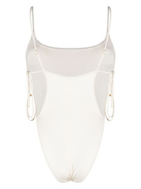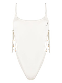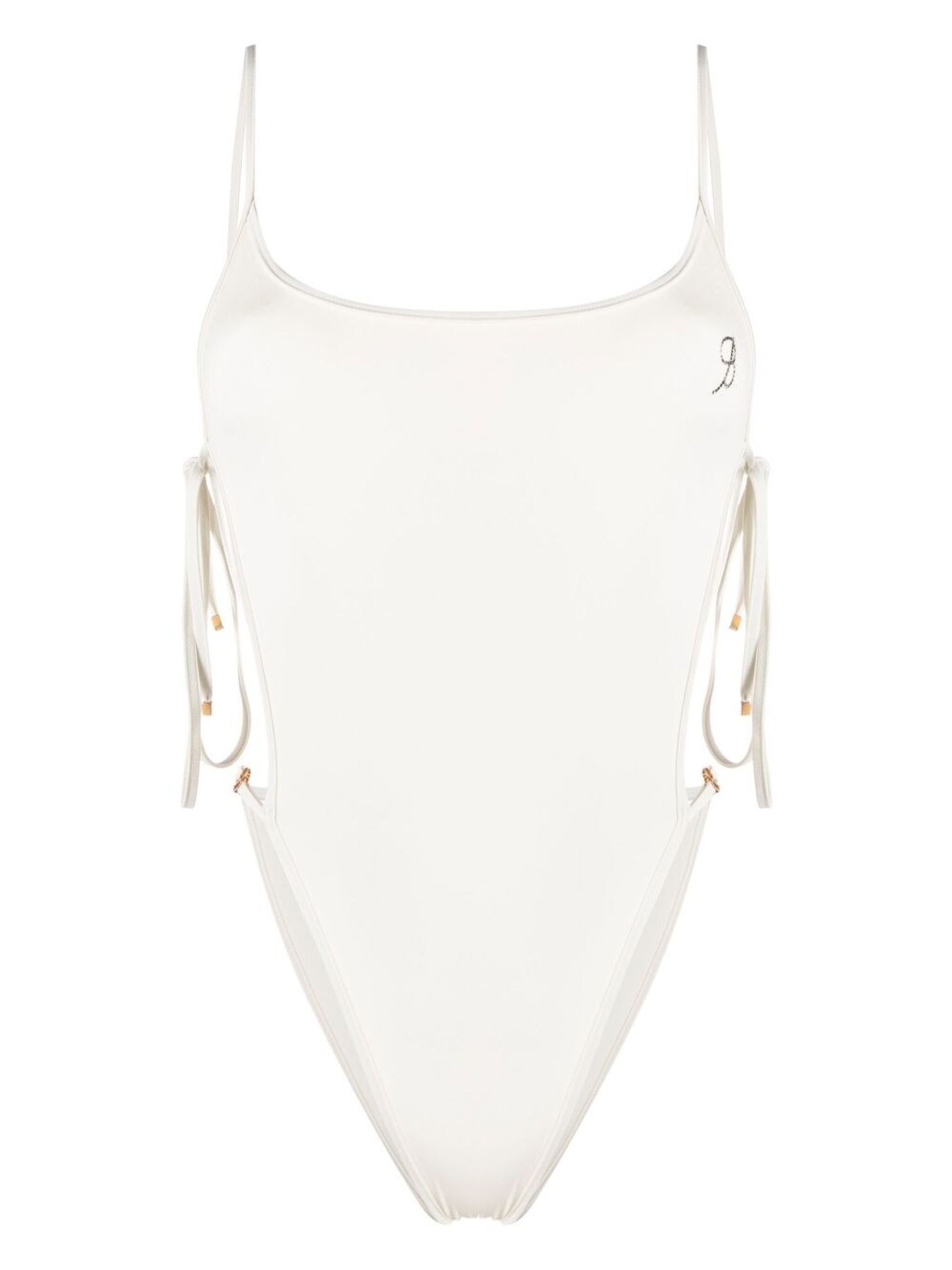 open tie side swimsuit from BLUMARINE featuring white, stretch-design, logo print at the chest, thin shoulder straps, gold-tone logo lettering, open back and open tie sides. Be mindful to try on swimwear over your own garments.. Size & Fit Model Measurements: Bust: 0cm Height: 0cm Hips: 0cm Waist: 0cm Fabric and Care Designer Style ID: P322D010A Designer Colour: N0103 - BIANCO NATURALE Composition: Spandex/elastane 27%, Polyamide 73% Washing instructions: Machine Wash Made in Italy