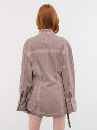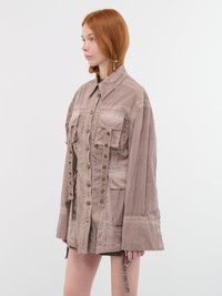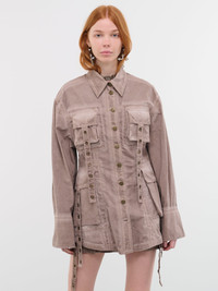 BLUMARINE shirt in brown, cargo design, over-dyed delavé canvas, pointed collar, button closure & cuffs, bellows pockets, eyelet flaps, slight cinched waist, back logo embroidery detail, relaxed fit. Made in Italy Italian Sizing 97% Cotton, 3% Elastane Model is 5'9" wearing size 40. Bust: 31.5" Waist: 23" Hips: 34"