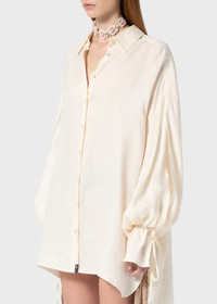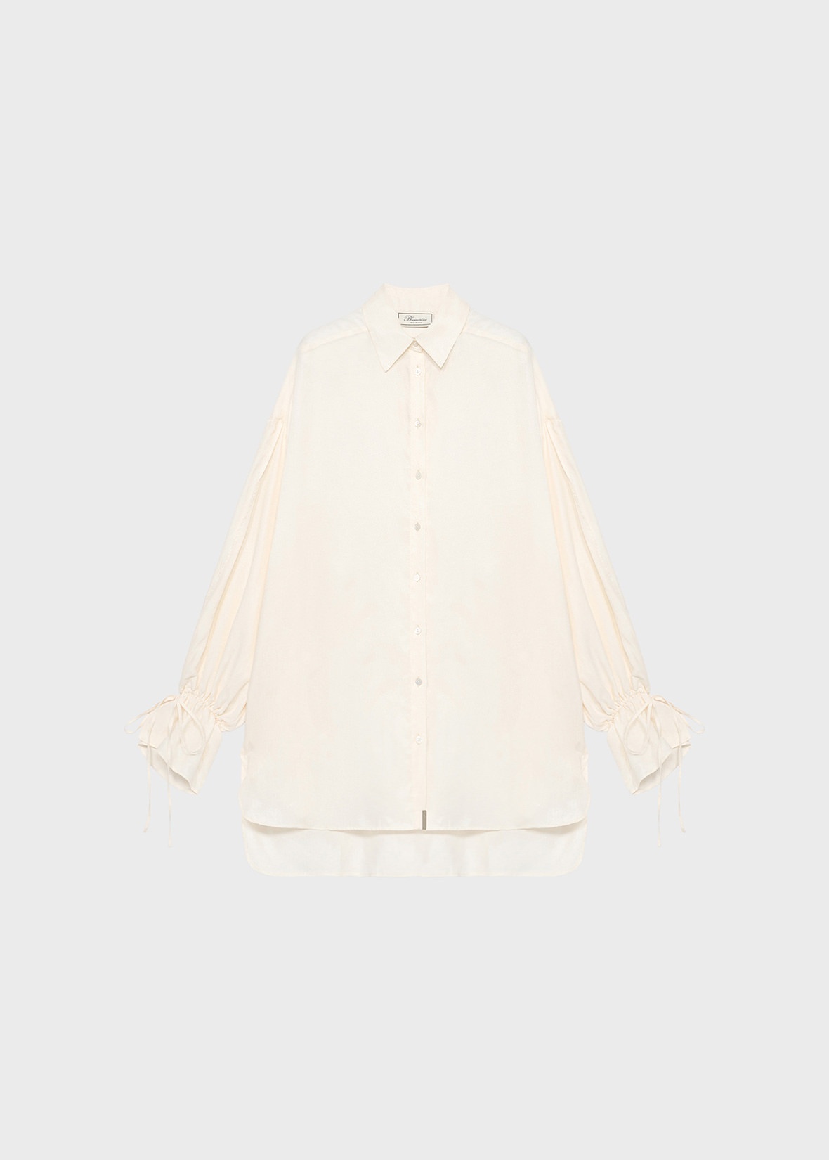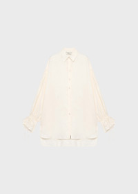 OVERSIZED LINE FOR THE SHIRT IN DELAVE VISCOSE GABARDINE WITH DROPPED SHOULDERS, LONG FITTED SLEEVES WITH DRAWSTRING AND TIES. COMPOSITION: 100%VI - DELAVE VISCOSE GABARDINE - OVERSIZED FIT - COLLAR - DROPPED SHOULDERS - BUTTON CLOSURE - LONG FLARED SLEEVES - PETAL-SHAPED CUFFS WITH DRAWSTRING AND TIES - METAL LOGO TAG - ASYMMETRIC BOTTOM - OVERSIZED FIT DETAILS COLORS: WHITE
