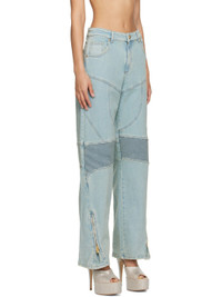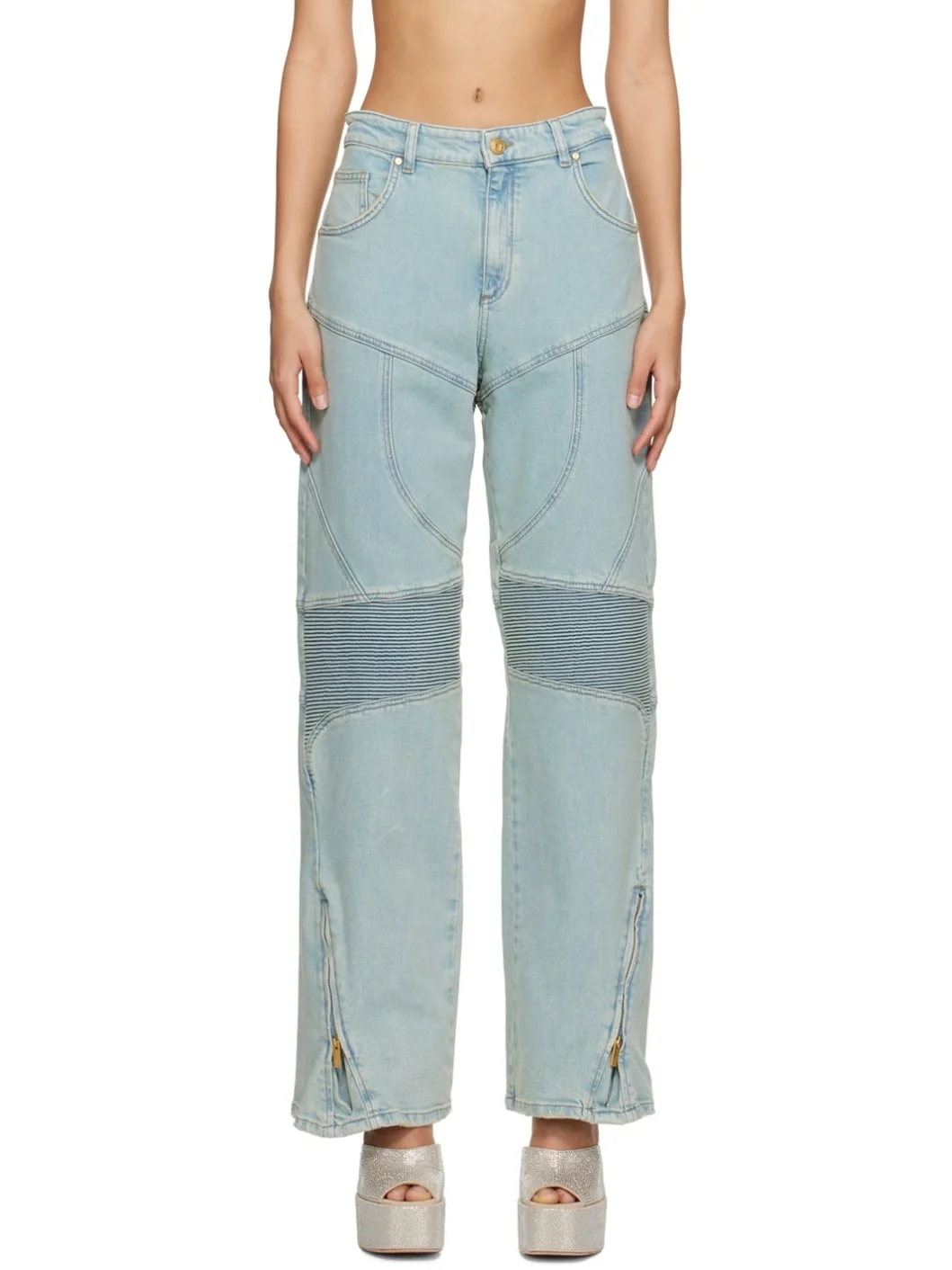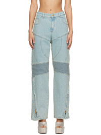 Stretch denim jeans. Fading and subtle distressing throughout. · Belt loops · Five-pocket styling · Zip-fly · Darts at front and back · Quilted panel at knees · Zip expansion panel at cuffs · Embroidered logo patch at back waistband Supplier color: Sterling blue 98% cotton, 2% elastane. Made in Albania 231901F069005