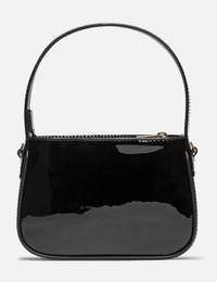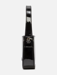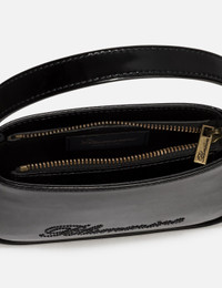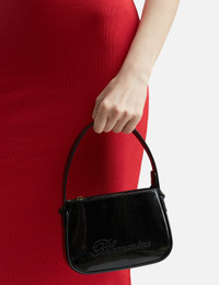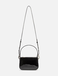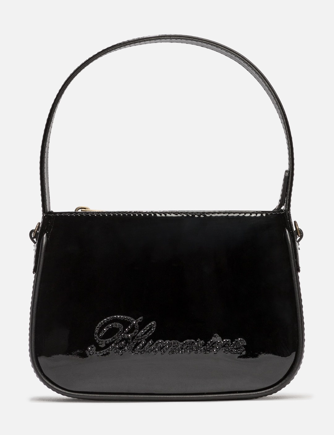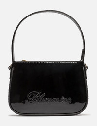 - Blumarine - [Blumarine]() - Patent Mini Bag - Patent calf leather exterior - Magnetic closure - Rhinestone logo embellishments to the front - Cotton lining - Interior card slot - Single top handle - Detachable, adjustable shoulder strap - Color: Nero - Country Of Origin: IT - Material: 100% Patent Calf Leather; Lining: 100% Cotton - See more Bags and Accessories SIZING Approximate dimensions: - Height: 13cm - Width: 18cm - Depth: 4cm - Handle Length: 12cm - Strap Length: 53cm