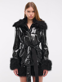 BLUMARINE coat in black, paneled faux leather construction, patent finish, spread collar, collar & cuffs feather trim, front buttoned placket closure, long sleeves, waist belt loops & self-tie belt, side pockets, straight hem, lined, slim fit. Made in Italy Outer: 68% Polyester 32% Polyurethane Inner: 57% Viscose 43% Polyester Padding: 100% Polyester Trim: 100% Meleagris Feather Accessory: 34% Polyester 16% Polyurethane 28% Cotton 22% Viscose European Sizing Model is 5'10" wearing size 40. Bust: 33" Waist: 23.5" Hips: 35.5"