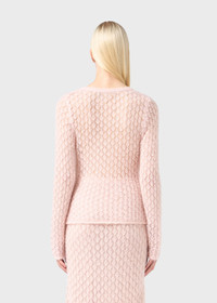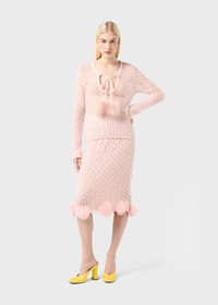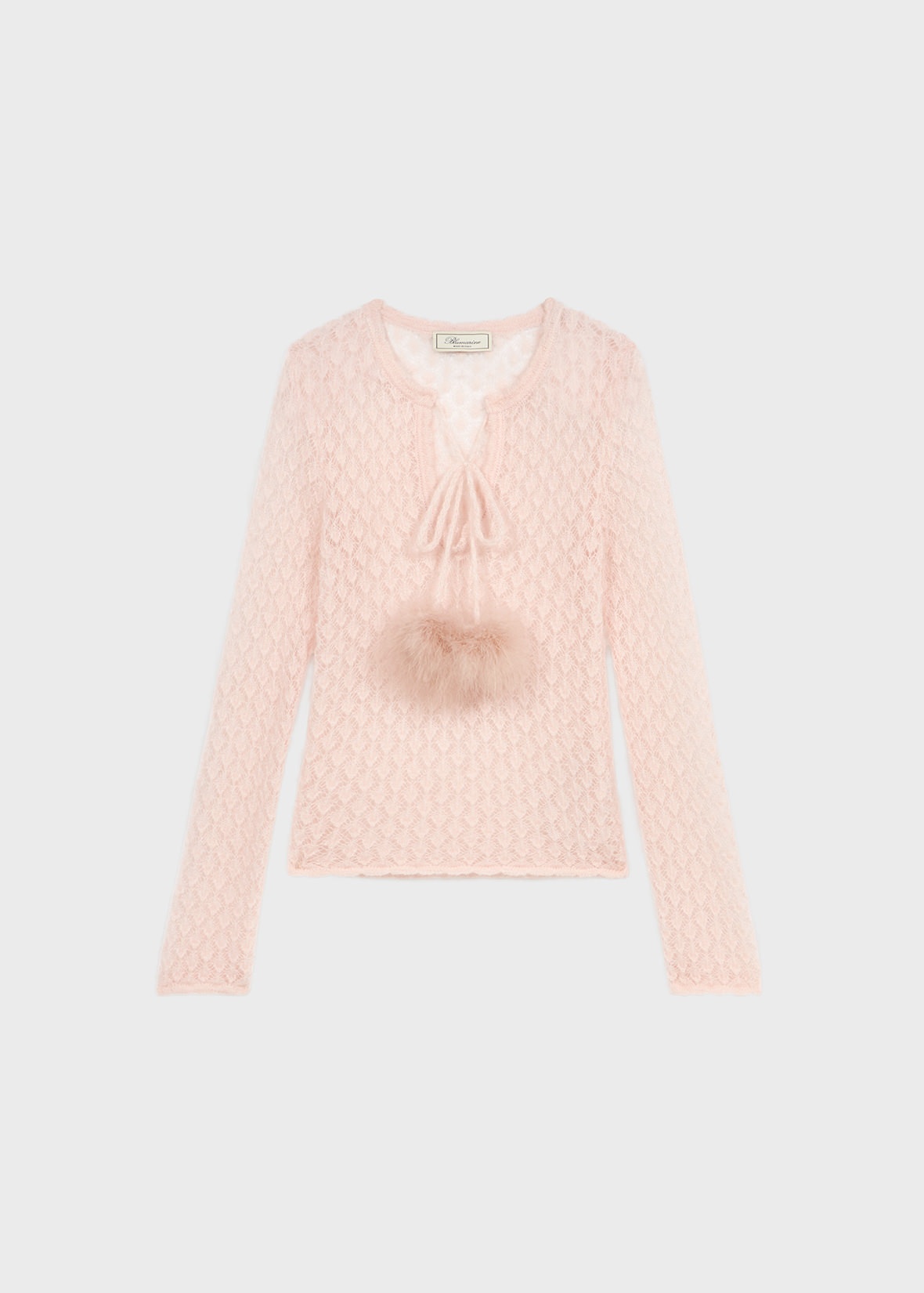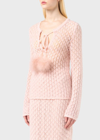DELICATE LACE STITCH MOHAIR-BLEND SWEATER WITH NECKLINE CLOSED BY TIES AND MARABOU FEATHER POM-POMS. COMPOSITION: 50%PA 46%WM 4%WO - MOHAIR BLEND YARN - LACE STITCH TEXTURE - ROUND NECKLINE - STRAP CLOSURE - MARABOU FEATHER POM-POM - LONG SLEEVES - TAPERED FIT DETAILS COLORS: PINK