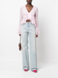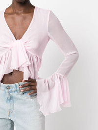 ruffled long-sleeve silk blouse Highlights - Light pink - Silk - Semi-sheer construction - Gathered detailing - Ruffled trim - V-neck - Long sleeves - Ruffle cuffs - Cropped - High-low hem Made in Italy Composition Silk 100% SIZE & FIT Model measurements Height 5 ft 10 in(1.77 m) Bust/Chest 32.28 in(82 cm) Hips 35.03 in(89 cm) Waist 25.19 in(64 cm) FittingInformation Designed for a slim fit that sits just away from the body offering a close yet comfortable fit Constructed with additional length on the sleeve Made from a lightweight non-stretch fabric, this piece offers minimal elasticity when worn This piece fits true to size – take your usual size Washing instructions Dry Clean Only