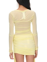 BLUMARINE top in yellow, pleated design, viscose jersey, semi-sheer, boat neckline, elongated sleeves, lettuce-edge, fitted. Made in Italy Italian Sizing 100% Viscose Model is 5'10" wearing size 40. Bust: 32" Waist: 25" Hips: 35"
