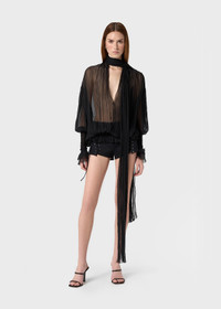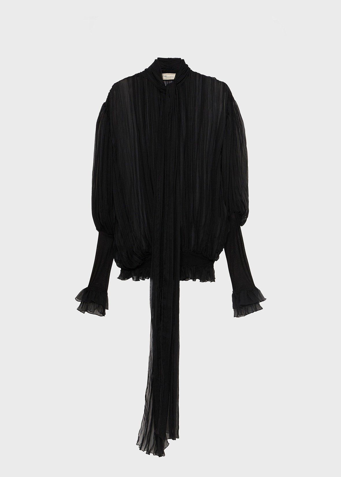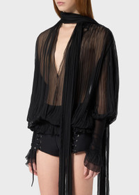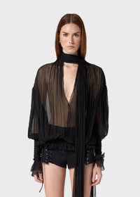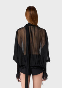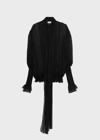 PLEATED SILK CHIFFON BLOUSE WITH A SCARF, V-NECKLINE, AND WIDE SLEEVES WITH JERSEY DETAILING. COMPOSITION:100%SE - PLEATED SILK CHIFFON - SCARF - V-NECK - LONG FLARED SLEEVES - JERSEY CUFF GLOVES - RUFFLED CUFFS - ELASTIC JERSEY BAND AT THE HEM - LOOSE FIT DETAILS COLORS: BLACK