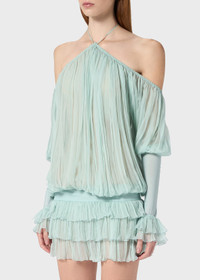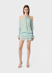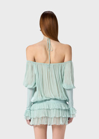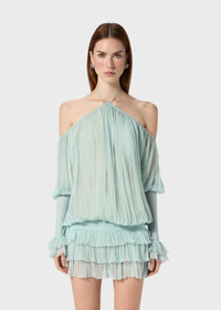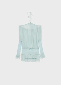 PLEATED CHIFFON DRESS WITH A HALTER NECKLINE AND STRAP DETAIL. WIDE SLEEVES WITH JERSEY DETAIL. COMPOSITION:100%SE - PLEATED SILK CHIFFON - HALTERNECK STYLE NECKLINE WITH TIE-UP STRAPS - SCALLOPED NECKLINE PROFILE - DROPPED SHOULDERS - LONG FLARED SLEEVES - GLOVE-STYLE VISCOSE JERSEY CUFFS - RUFFLED CUFFS - JERSEY WAISTBAND FOR A BLOUSON EFFECT - PLEATED FLOUNCES AT THE BOTTOM - OPEN BACK - JERSEY WAISTBAND FOR A BLOUSON EFFECT - LOOSE FIT DETAILS COLORS: LIGHT BLUE