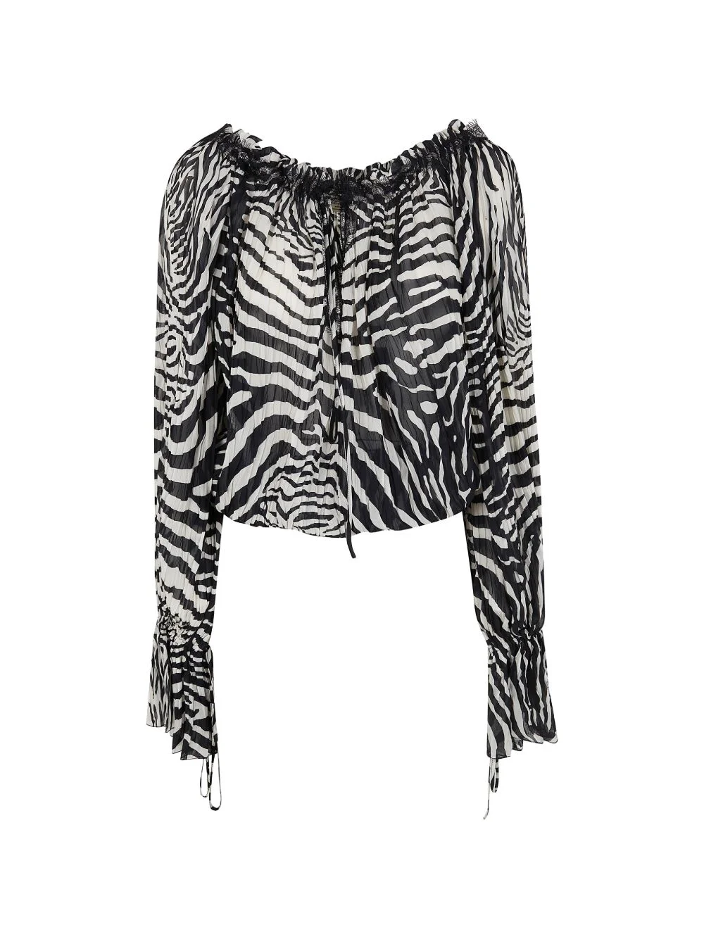 long-sleeve animal-print blouse Highlights - White and black - Animal print - Lace trim - Long sleeves - Drawstring detail - Ruffled cuffs Imported Composition Viscose 100% Washing instructions Read Manufacturer Guidelines