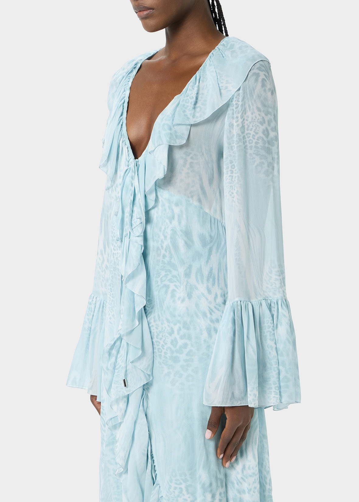 LONG VISCOSE CHIFFON DRESS IN A LIQUID LEOPARD PRINT, FEATURING A V-NECKLINE AND RUFFLED DETAILS. COMPOSITION: 100%VI - VISCOSE CHIFFON - LIQUID LEOPARD PRINT - NECKLINE, CUTOUT, AND HEM FINISHED WITH RUFFLE TRIM - V-NECK - LONG SLEEVES WITH RUFFLE DETAILING AT THE CUFFS - JEWEL BUTTON CLOSURE - FULLY LINED - FLOOR-LENGTH - LOOSE FIT DETAILS COLORS: LIGHT BLUE, SILVER