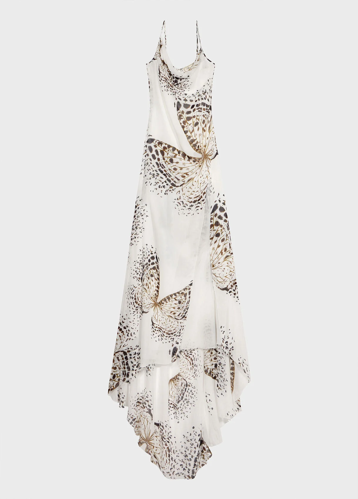 Long slip dress in butterfly print viscose georgette, featuring a draped neckline and a side slit. - Viscose georgette with butterfly print - Sleeveless - Double straps - Draped neckline, side slit on one leg, back neckline - Short train - Back zip closure - Removable slip, floor length, regular fit DETAILS To find the correct size for you, please consult the Size Guide. Composition: Main fabric: 100% Viscose | Slip: 100% Polyester Gently wash at max 30°C; Do not bleach; Do not tumble dry; Iron at low temperature - without steam; Dry clean with tetrachloroethylene or hydrocarbons - gentle process; Dry hanging in the shade; Wash inside out; Gentle spin; Wash in a mesh bag; Iron inside out