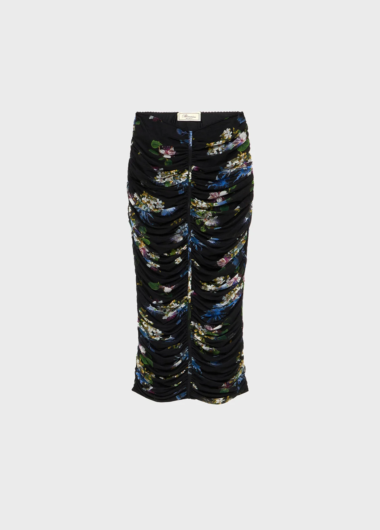 midi tulle stretch skirt with bouquet print and gathered pattern. - Bouquet printed stretch tulle - Lace trim at the waist - All-over gathered pattern - Zip closure on one side - Inner lining - Midi length - Body-hugging fit - Made in Italy DETAILS To find the correct size for you, please consult the Size Guide. Composition: Main fabric: 94% polyamide, 6% elastane; Fabric 2: 75% polyamide, 25% elastane; Trimmings: 80% polyamide, 20% elastane Wash delicate cycle max 30°C; Do not bleach; Do not tumble dry; Do not iron; Dry clean with tetrachloroethylene or hydrocarbons - gentle cycle; Dry flat in shade; Wash inside out; Gentle spin