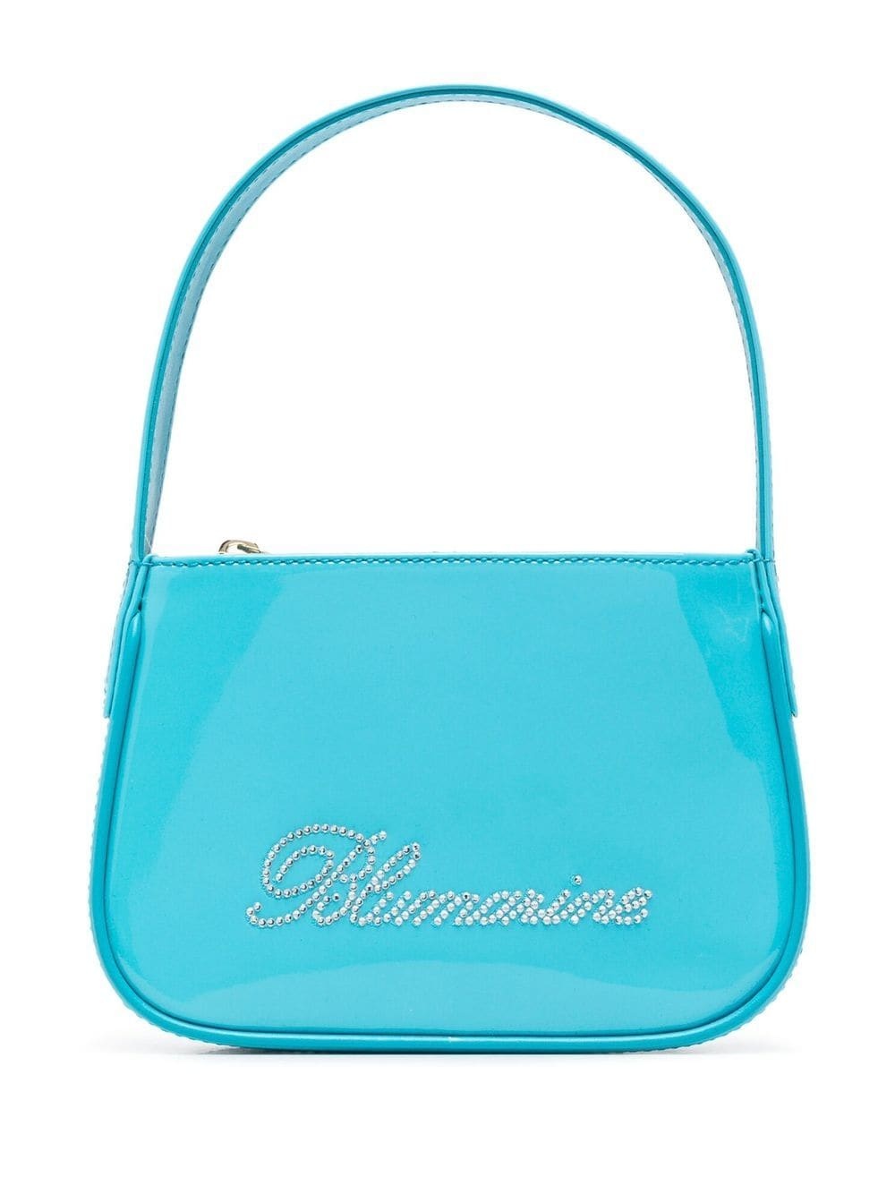 rhinestone-embellished mini bag rhinestone-embellished mini bag from BLUMARINE featuring cyan blue, calf leather, cotton, high-shine finish, rhinestone embellishment, gold-tone hardware, top zip fastening, single top handle and internal logo patch. Composition Outer: Patent Calf Leather 100% Lining: Cotton 100% SIZE & FIT Model measurements Height 5 ft 11 in(1.8 m) Bust/Chest 32.3 in(82 cm) Hips 35.4 in(90 cm) Waist 22.8 in(58 cm) Measurement DEPTH 2 in(5 cm) HANDLE 5.5 in(14 cm) HEIGHT 5.1 in(13 cm) WIDTH 7.5 in(19 cm)