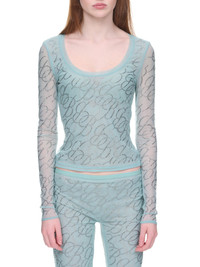 BLUMARINE top in blue, rhinestone logo motif, stretch tulle, semi-sheer, scoop neck, long sleeves, slim fit. Made in Italy Italian Sizing 82% Nylon, 18% Elastane Model is 5'10" wearing size 38. Bust: 32" Waist: 24" Hip: 34"