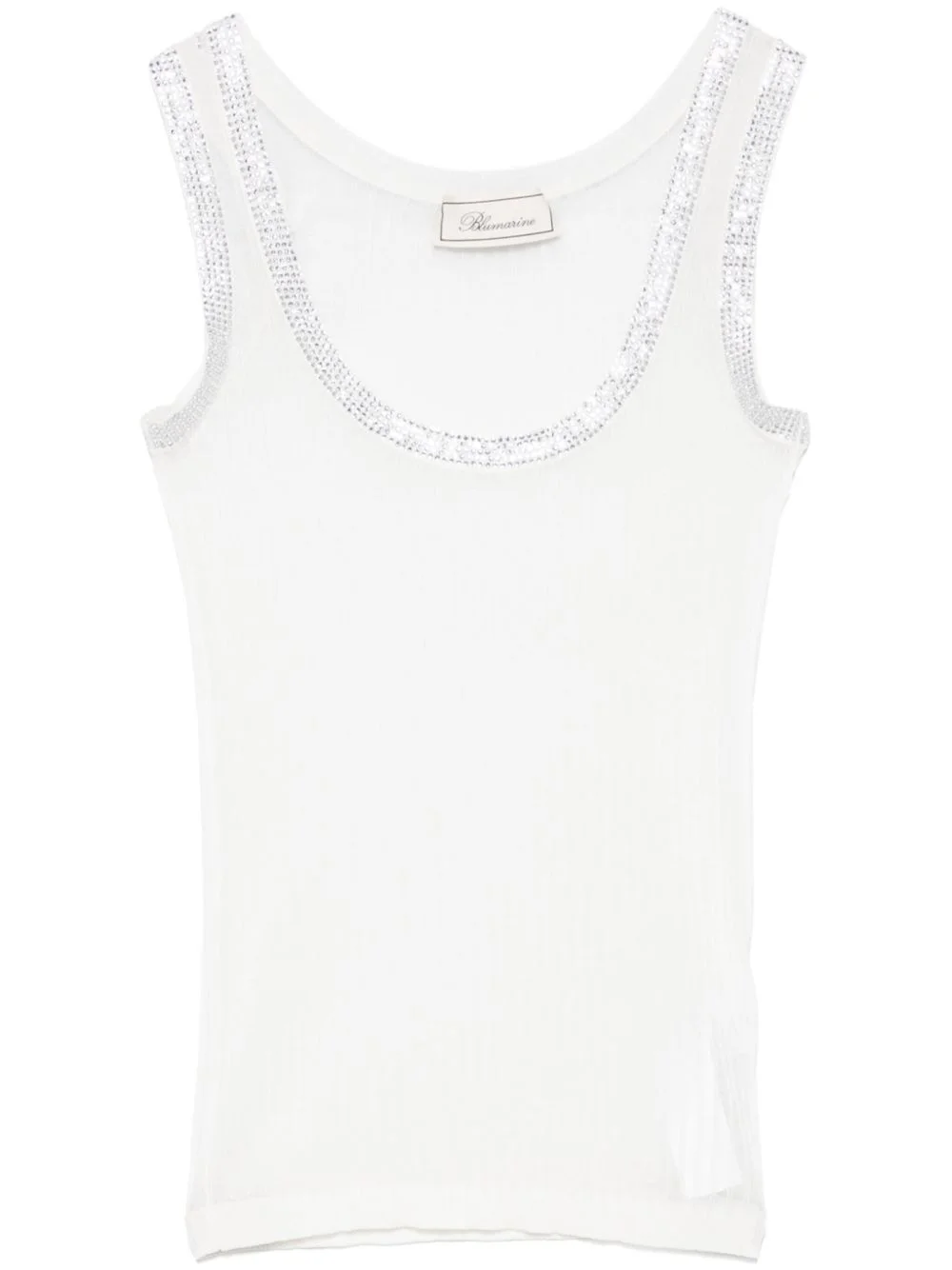 ribbed-knit tank top Highlights - White - Glass crystal embellishment - Scoop neck - Sleeveless Imported Composition glass 100%, Cotton 82%, Polyamide 18% SIZE & FIT Model measurements Height 5 ft 10 in(1.78 m) Bust/Chest 33.46 in(85 cm) Hips 36.22 in(92 cm) Waist 23.22 in(59 cm) FittingInformation Designed for a close fit throughout Made with a fine knit, this piece offers some stretch