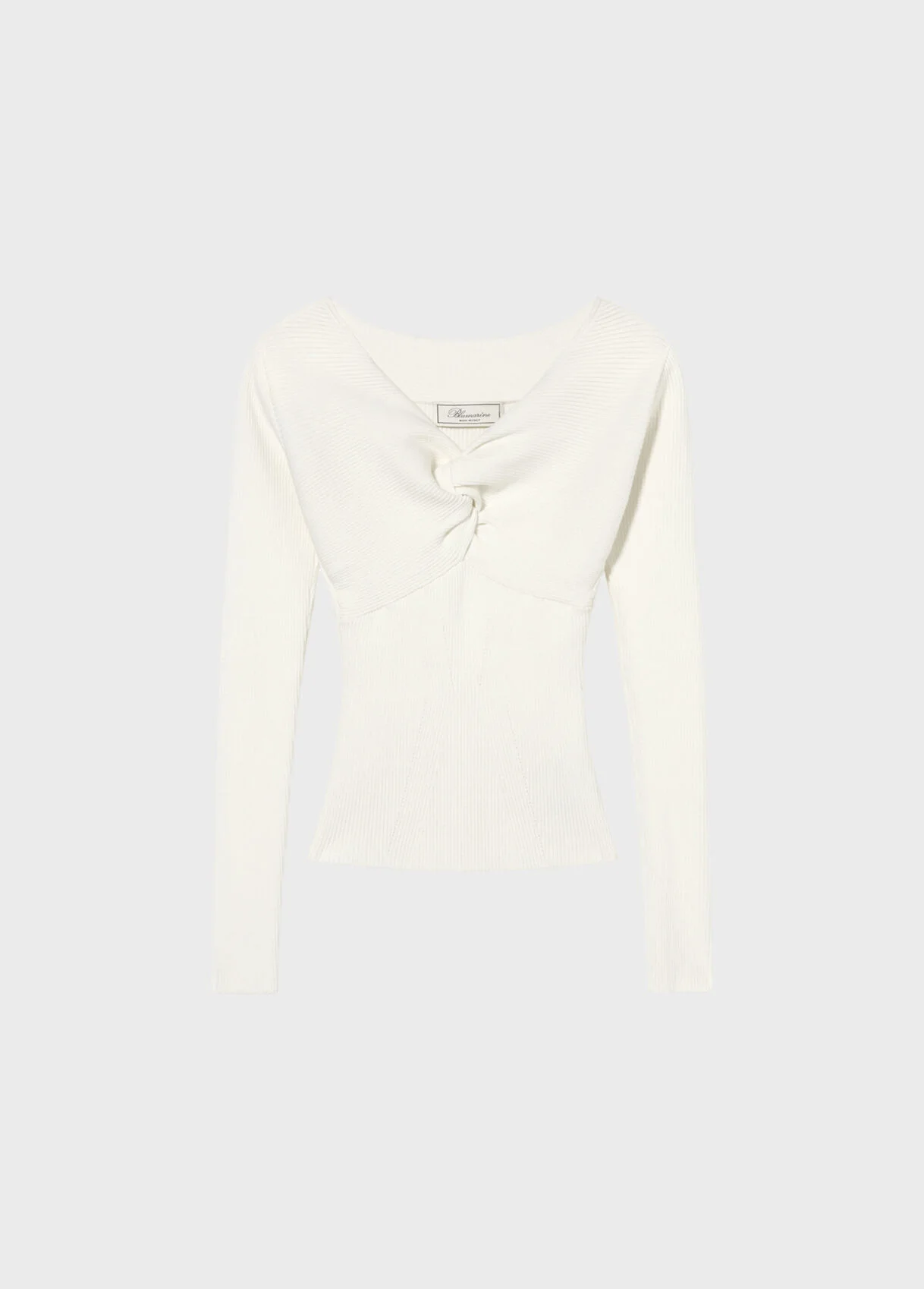 stretch ribbed viscose sweater with a v-neck enhanced by a knot. - Ribbed viscose - V-neck - Knot at the decolletage - Showcase of openwork - Long sleeves - Body-fitting cut - Made in Italy DETAILS To find the correct size for you, please consult the Size Guide. Composition: Yarn 1: 70% viscose, 30% polyester Wash very delicate cycle max 30°C; Do not bleach; Do not tumble dry; Iron at low temperature - no steam; Do not dry clean; Dry flat in shade; Wash inside out; Iron inside out